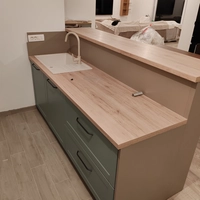 Kuhinja ide na jedan zid dužine 4 metra, samo donji elementi dubine 60 cm, visine 95 cm. Kuhinja je boje prirodnog drveta (svijetlo drveni dekor), dovod i odvodnja se nalaze na mjestu gdje je predviđen sudoper. Nasuprot kuhinje je otok dužine 1,5 m i širine 90 cm u istoj boji. Radna površina je mramorno bijele boje. Perilice, hladnjake i ostale aparate imam svoje. Šaljem skicu.