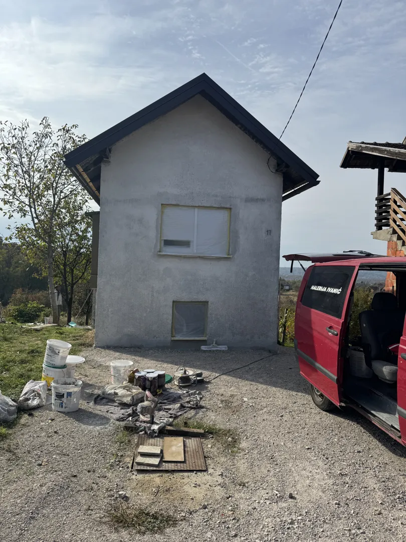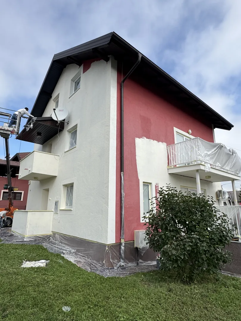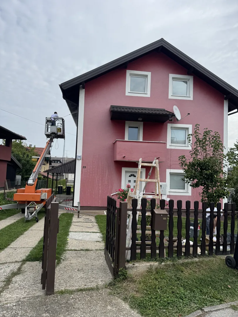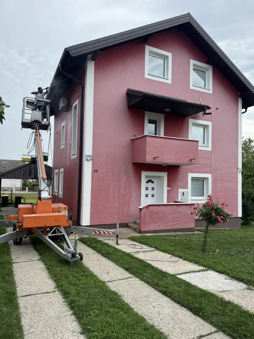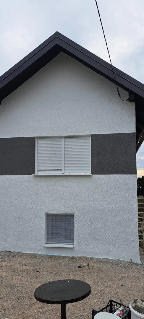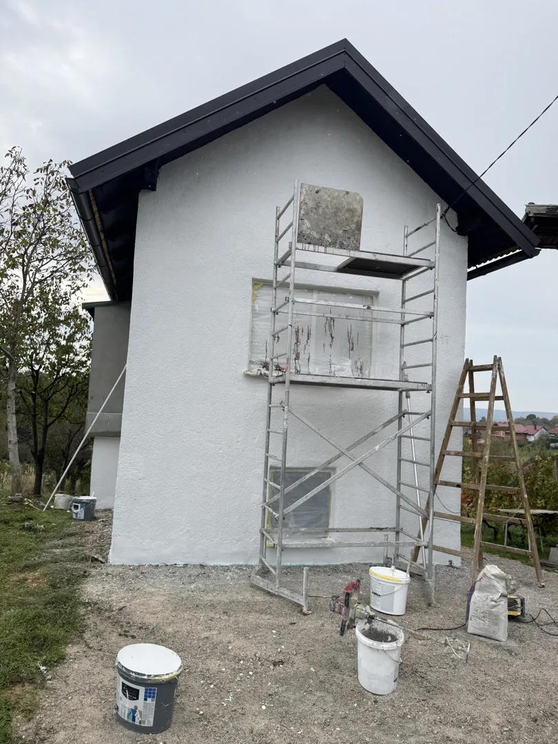 Na prizemnici je već postavljen stiropor, rubne lajsne , mrežica i prvi sloj ljepila. Potreban je nanos drugog sloja ljepila i završnog sloja. Potrebna je skela visine 6 m na (zabatne strane, dvostrešni krov). Materijal bi mi kupili. Površina fasade bez odbijanja otvora je kvadrata. Lokacija je Križevci. Molim vas cijenu radova sa uključenom skelom i postavljanjem iste.