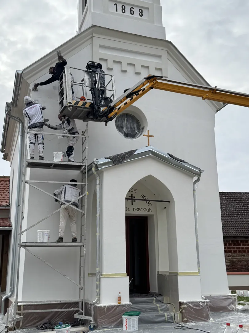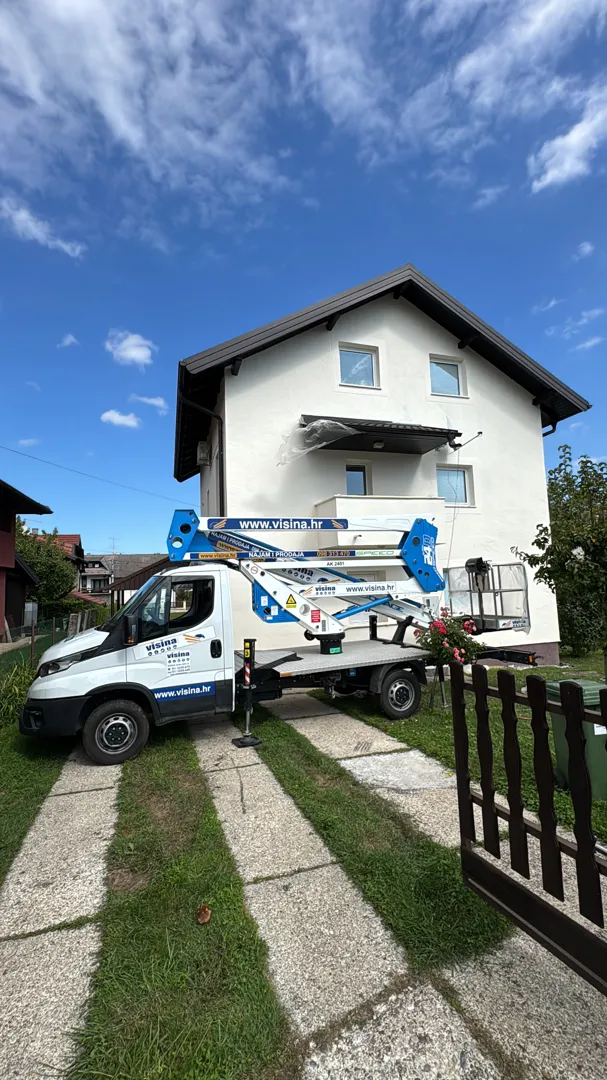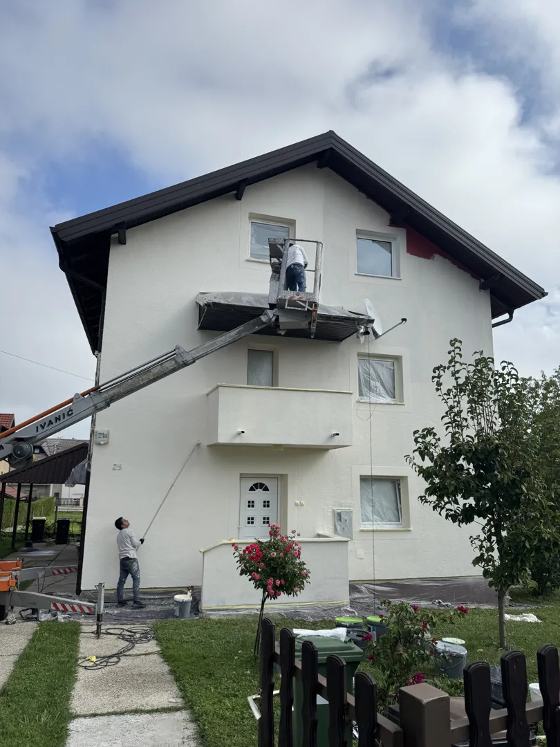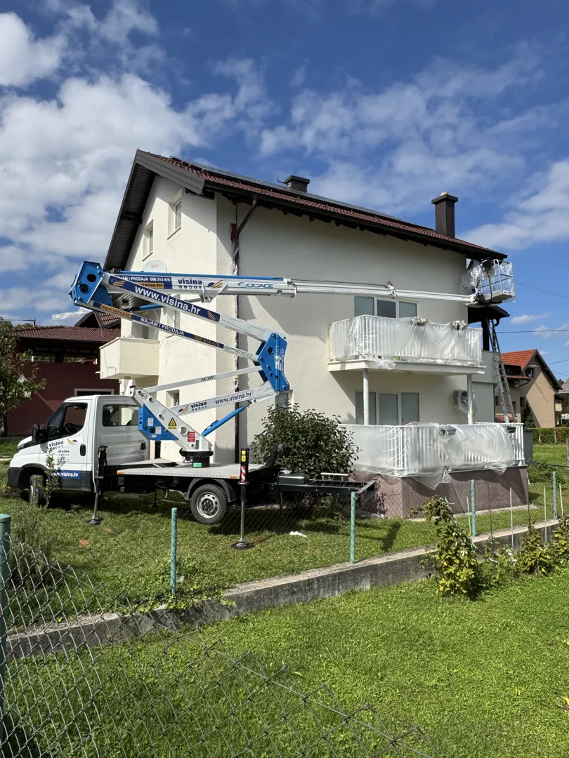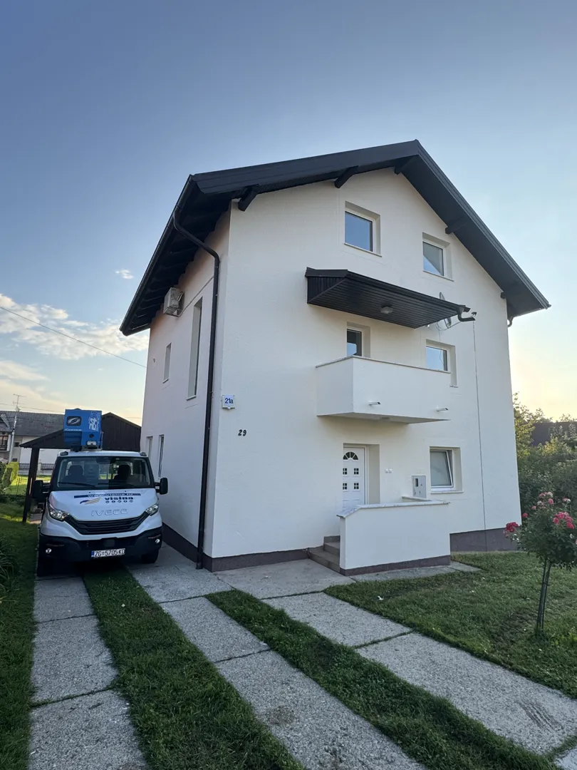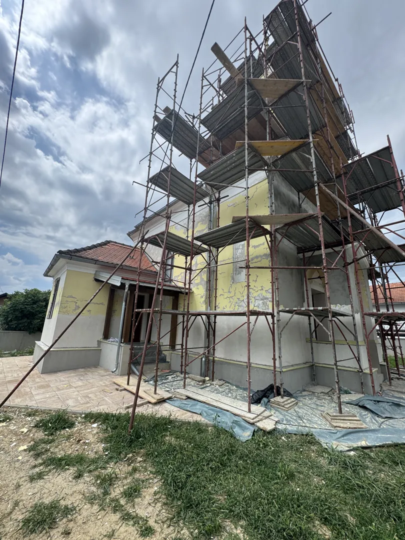 Na prizemnici je već postavljen stiropor, rubne lajsne , mrežica i prvi sloj ljepila. Potreban je nanos drugog sloja ljepila i završnog sloja. Potrebna je skela visine 6 m na (zabatne strane, dvostrešni krov). Materijal bi mi kupili. Površina fasade bez odbijanja otvora je kvadrata. Lokacija je Križevci. Molim vas cijenu radova sa uključenom skelom i postavljanjem iste.