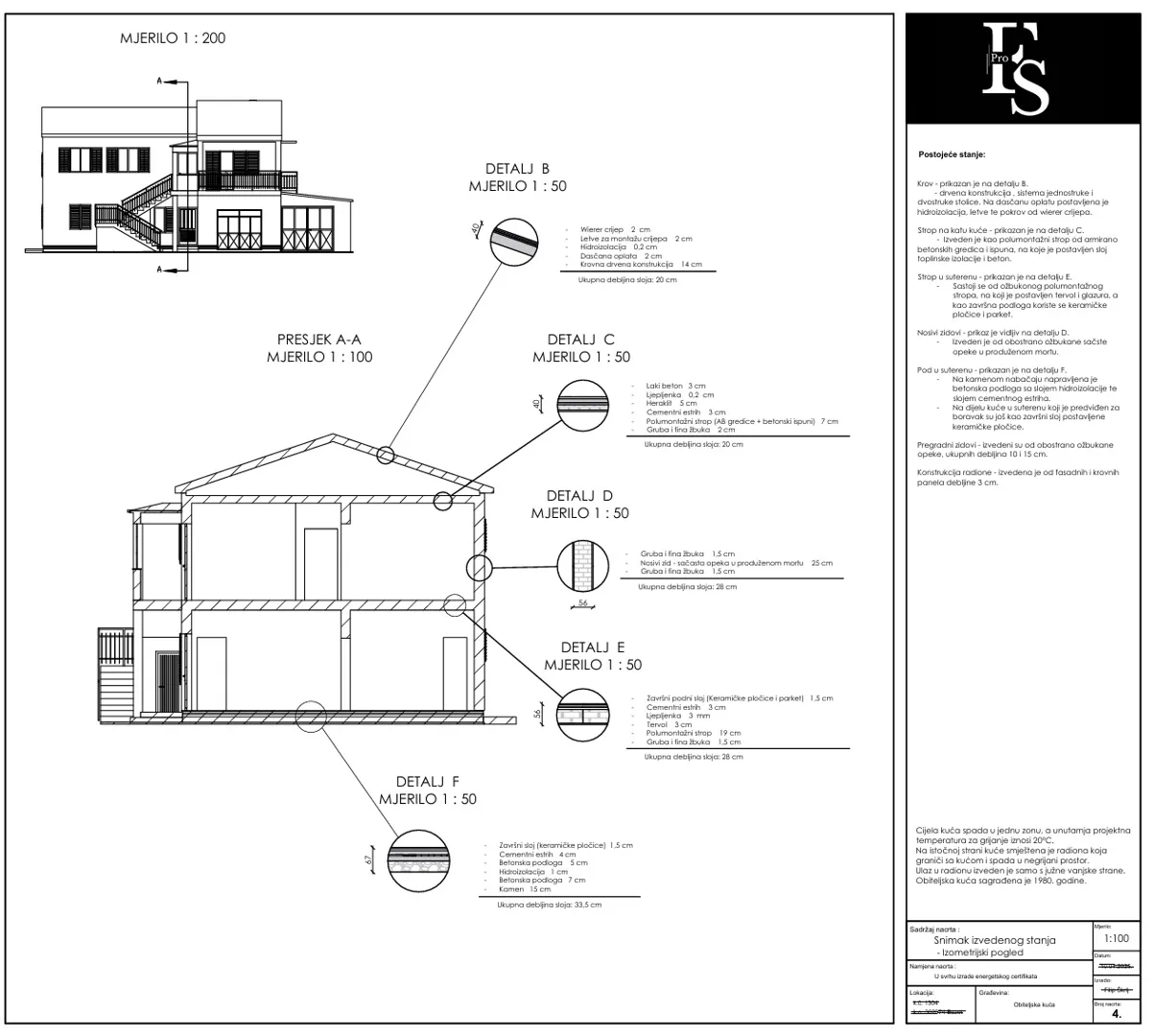 Potrebna je izrada energetskog certifikata za apliciranje na objavljeni natječaj za energetsku obnovu obiteljskih kuća. U pitanju je kuća površine cca m2, izgrađena početkom 20. st. Kuća ima grijanje na plin, a prozori su dijelom drveni, dijelom PVC sa dvostrukim staklom i stari oko 25 godina. Fasada je u lošem stanju. U kući se nalaze dva stambena prostora i jedan mali lokal.