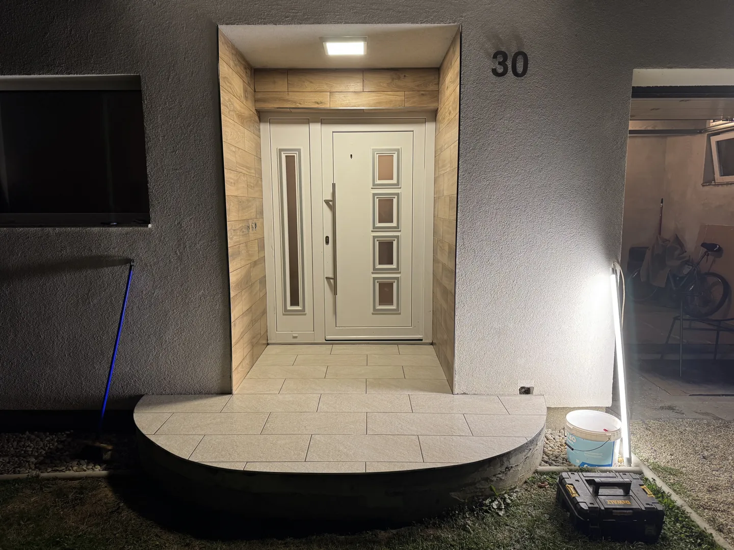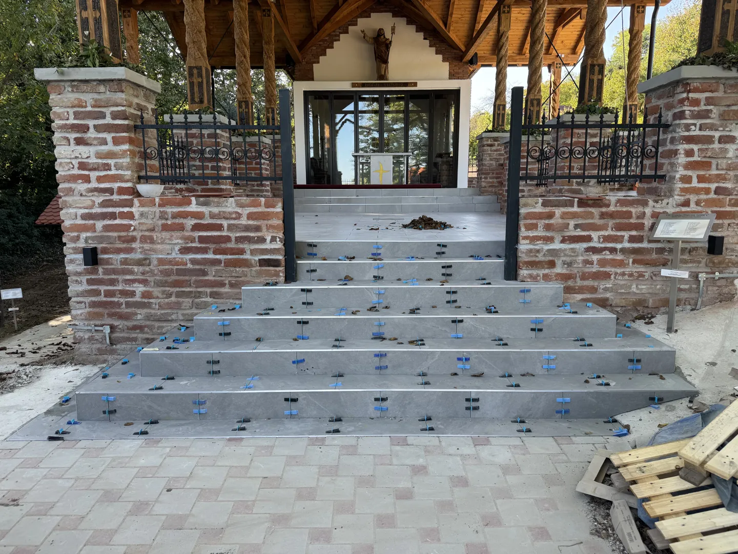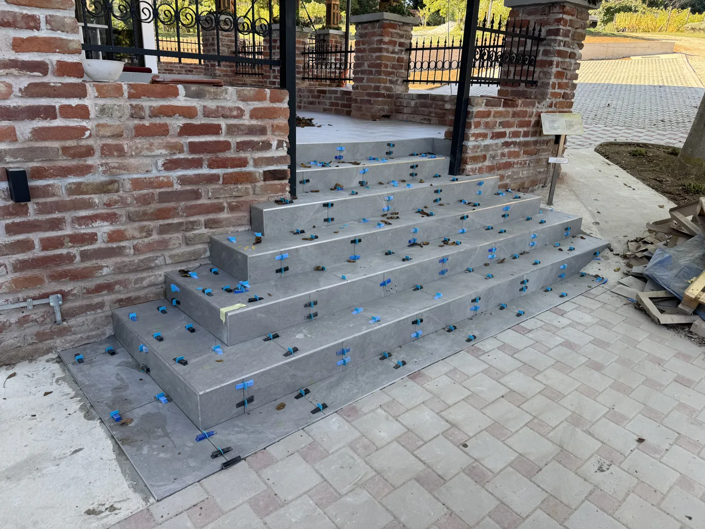 Postavljanje pločica na verandi (Dio pod krovom , dio otvoren) Od istih pločica postavljanje mozaika na nekoliko mjesta na verandi (zidna polica, vanjski zidani kuhinjski element, stup ). Postavljanje pločica na stepenicama.