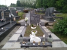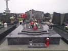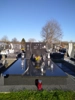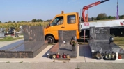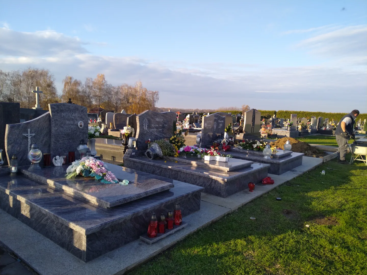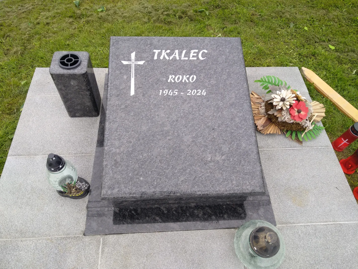 Potrebno je izbrusiti s piramide dva imena i uklesati 2 nova imena, ploča ostaje. Na grobu treba tamni (crni ili prošarano crni, da paše uz piramidu koliko je moguće koja ostaje) mramor, ploča drbljine 5 cm uz zaobljene rubove ili bez, zavisi o cijeni. Tocne dimenzije groba ne znam, negdje je srednje širine, nije onaj uski pa nije ni najširi.
