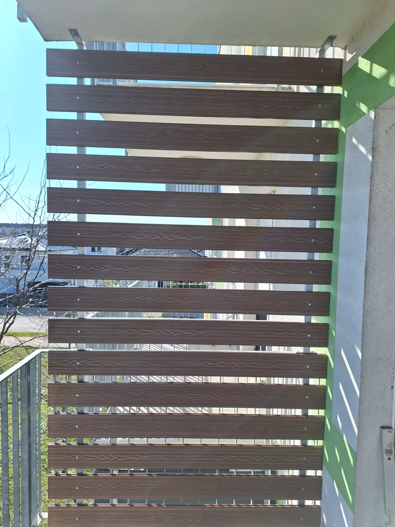 Balkonska ograda ukupne dužine 6,07m x 1m visine ( gore + dolje ) Stupovi : 80x50mm Boja plastificiranja : m Rukohvat : 60x40mm Model ispune : kosi model mm ( bez razmaka ) , može i ravni s razmakom. Materijal : aluminij
