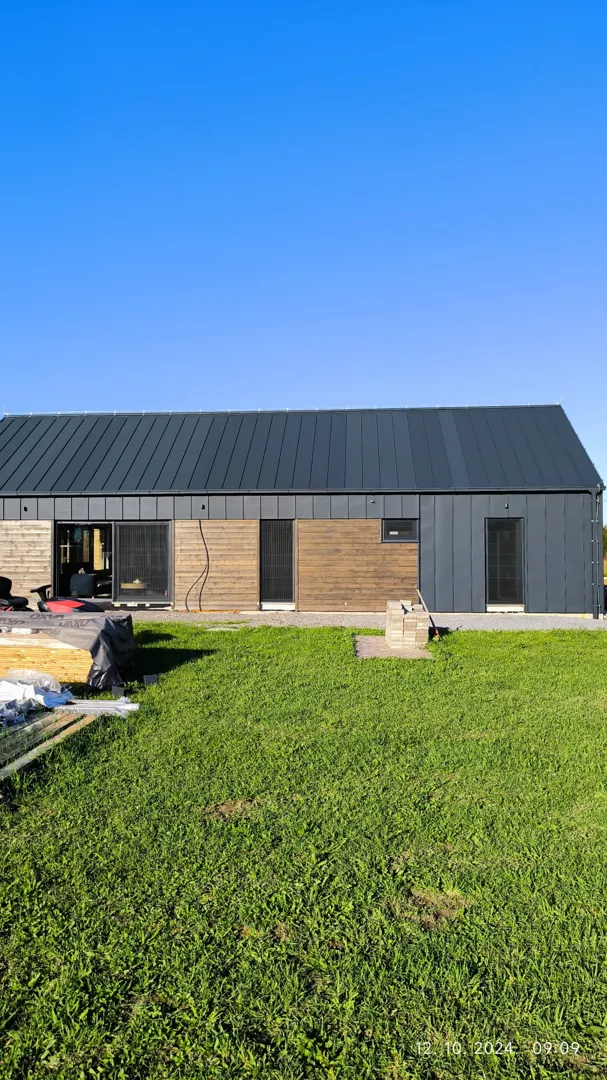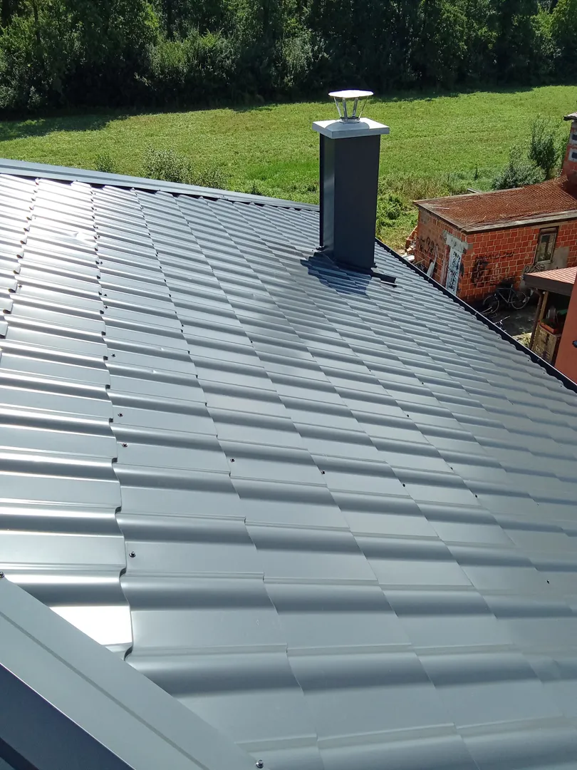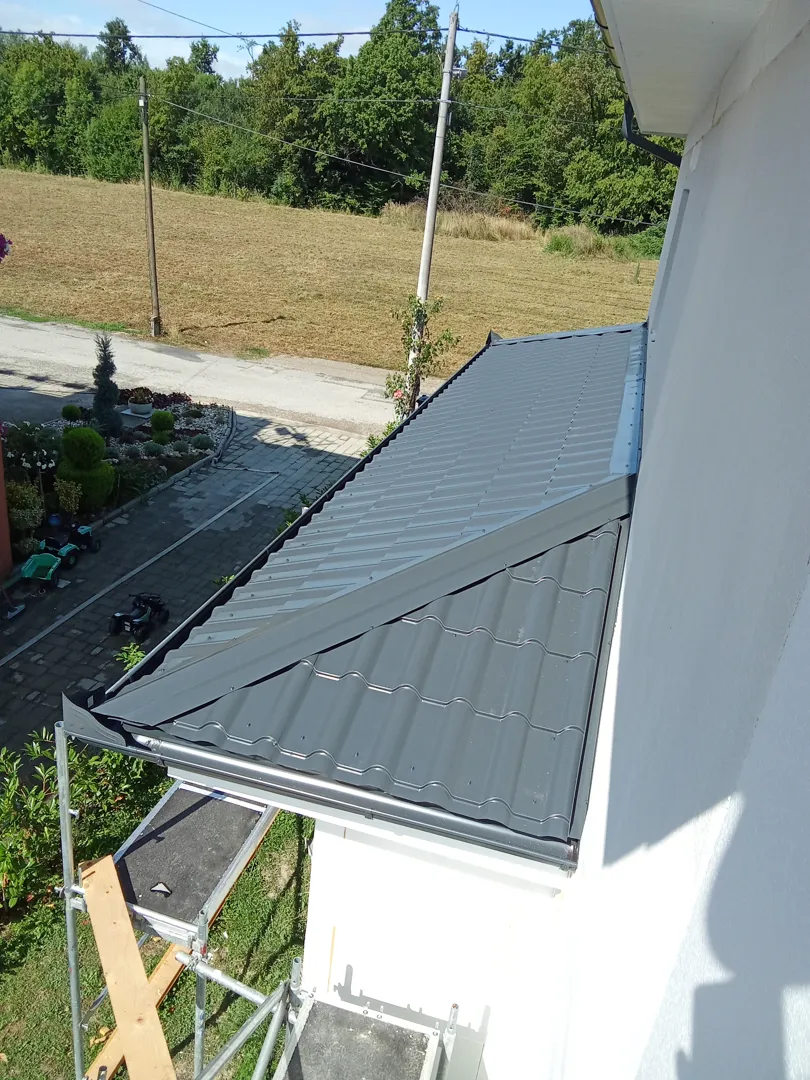 Dvostrešni krov, nagiba 25°, valovite cem. ploče. Skidanje ploča s odvozom, skidanje letvi, oluka. Postava OSB ploča 15mm, folije, letvi, kontraletvi, postava lima trapeznog profila, mrežice za prozračivanje, opšav 2 dimnjaka 45/45 cm, postava oluka i vertikala, vjetrolajsni, zatvaranje prostora između rogova, OSB ploča i fasadne plohe limom.