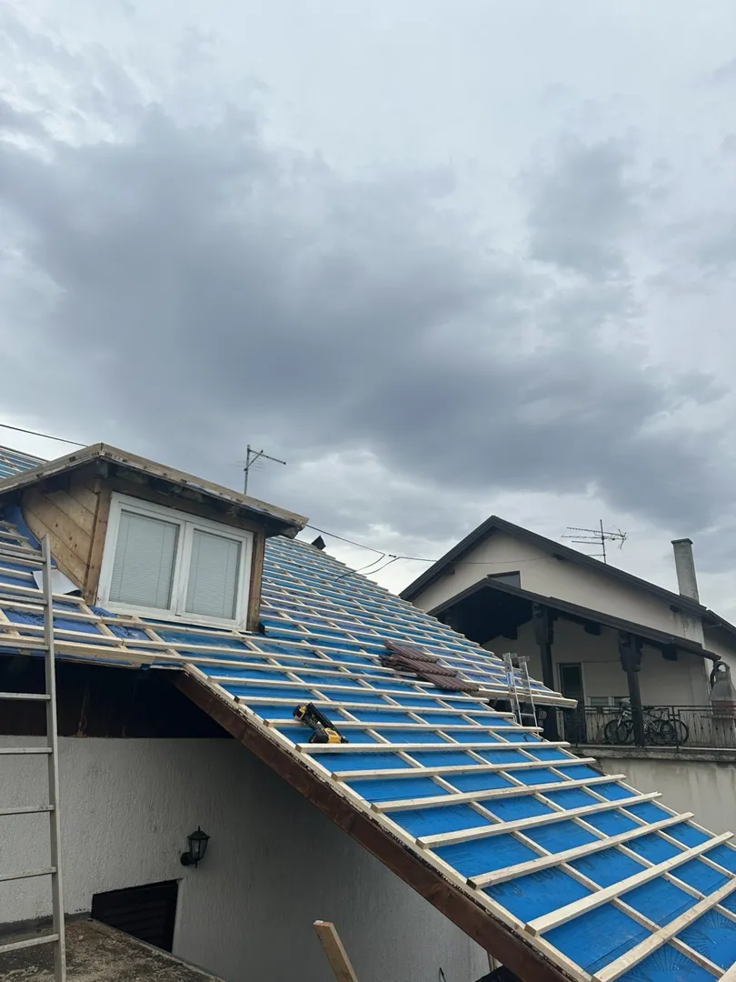 Samobor-Obiteljska kuća, 10,5 x 11,5m zamjena krovišta (salonit ploće)-{djelomično stradalo sad u nevremenu oštećenjem pada djela dimnjaka kojeg treba malo dozidati. Trenutno krovne rupe zatvorene drugim pločama}. Molim ponudu,[pristup kući ravno i lako dostupno]. Demontaža starog pokrova cca m². Postavljanje dasaka na konstrukciju,letvi,kontraletvi i folije... Pokrov s limenim pločama imitacije crijepa. Na kraju i građ.limarija sa olucima.