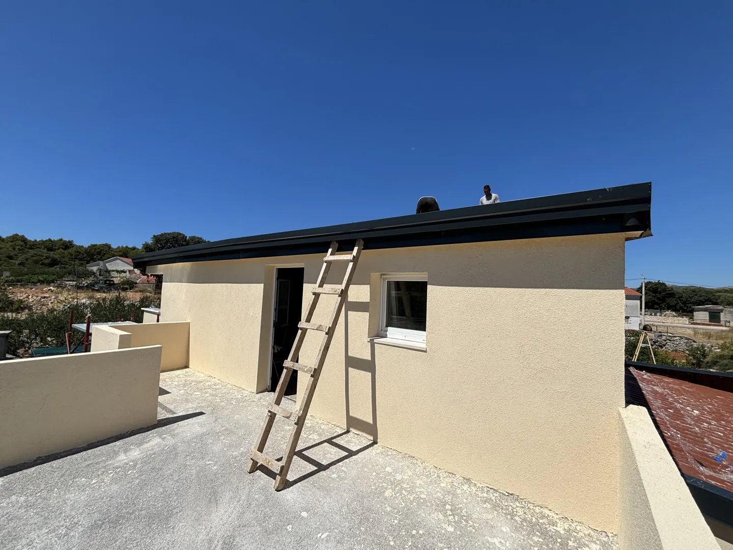 Izrada ravnog krova sa slijedećim slojevima: estrih u padu, bitumen, xps 20 cm, tpo folija, geotekstil (ili čepasta folija), šljinak 5 cm.