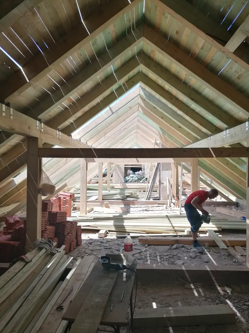 Skidanje komplet krova, crijep i grede. Zatim po dogovoru s izvodacem viditi dal treba zabate rusiti i zidati nove ili mogu ostati kako je. Ono sto bi svakako htio je podici novi krov za tri reda bloka plus betonski vjenac i trebalo bi napraviti ulaz s boka u potkrovlje kao sto je na slici u privitku. Limarski radovi mi ne trebaju. Molijo bi ponudu samo za ruke materijal po dogovoru s izvodacem mogu sam pribaviti.