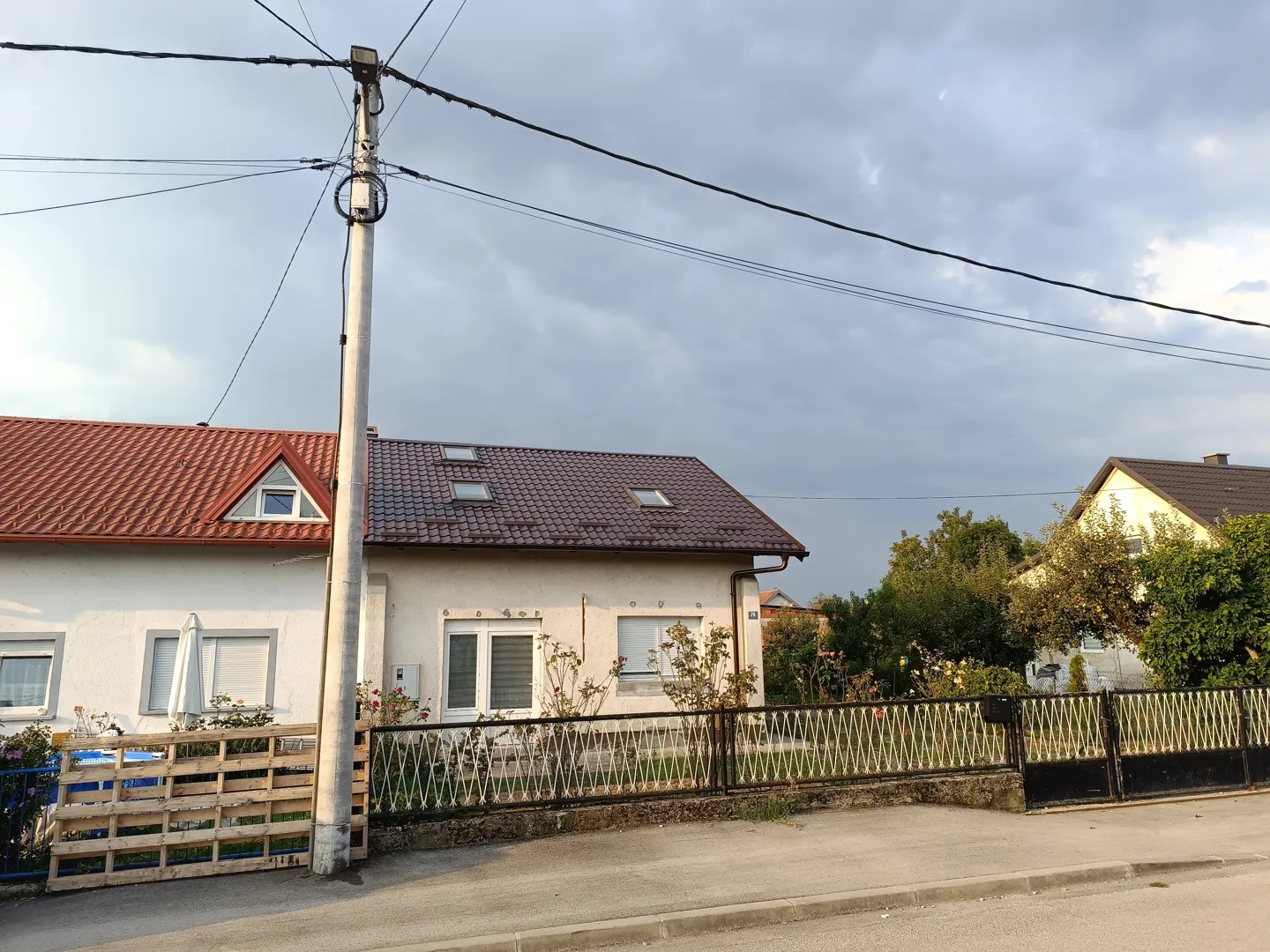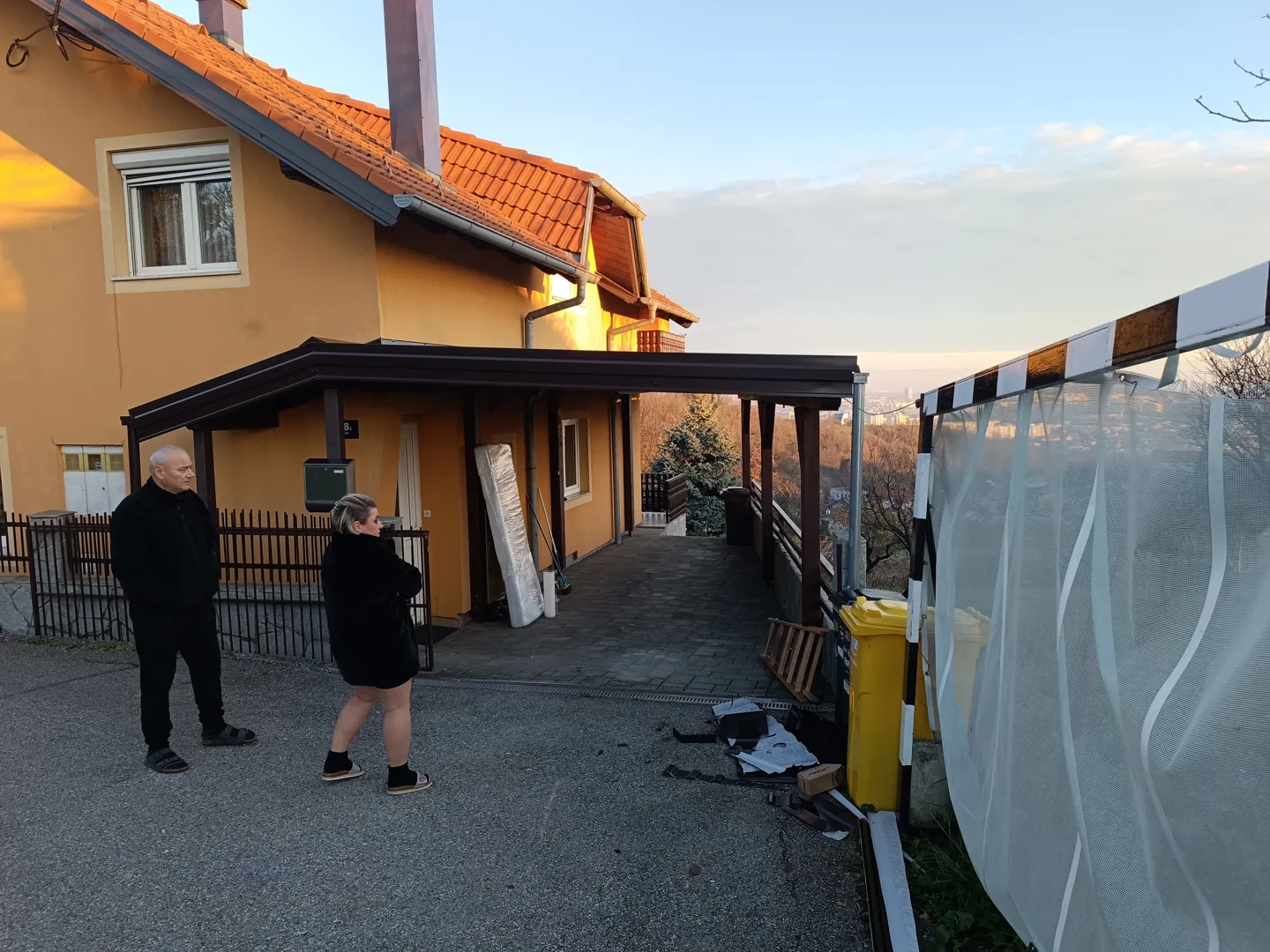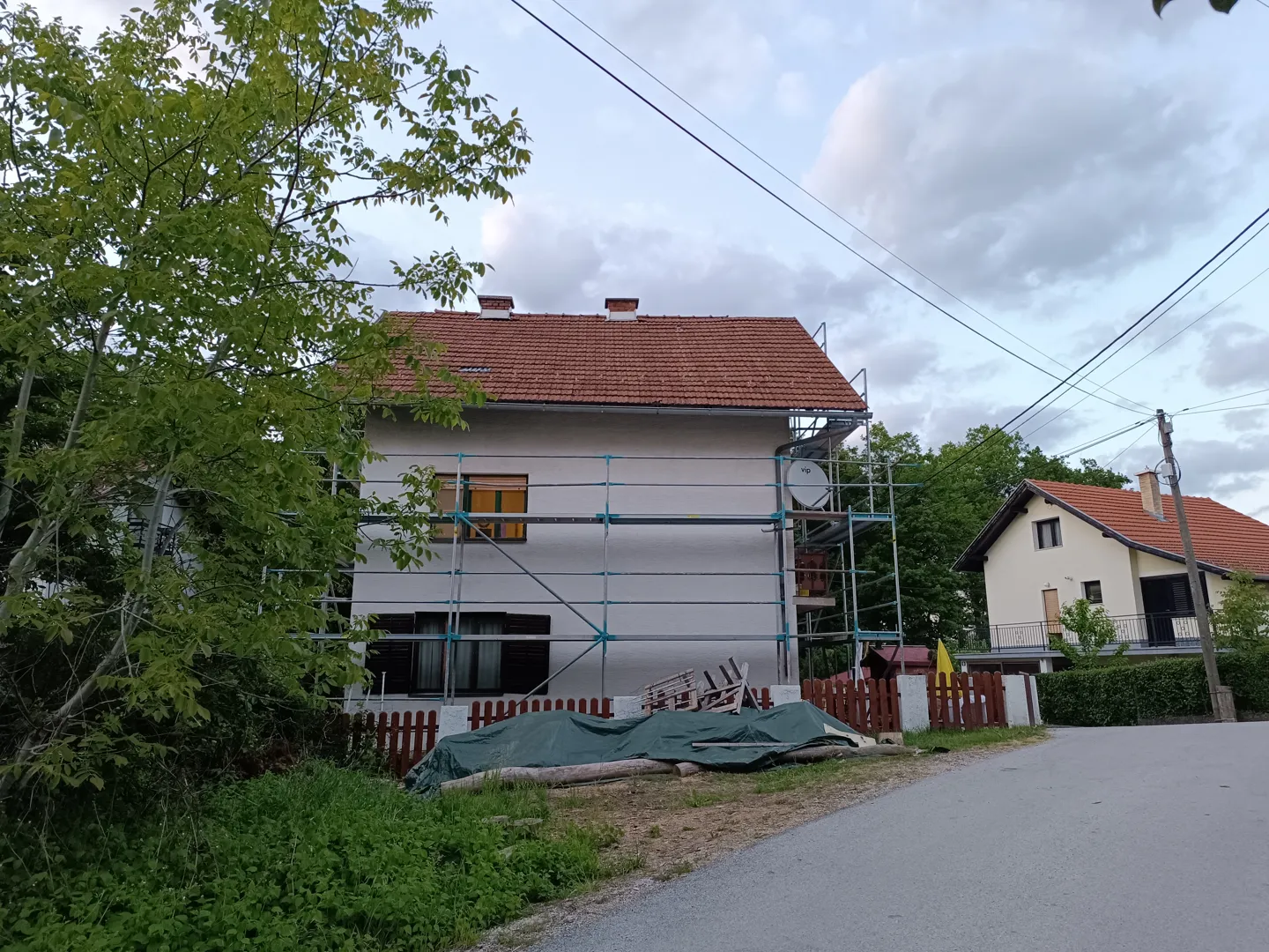 Uslijed nevremena drvo je palo na krov te napravilo štetu na krovu i žljebovima. Zamjenske krovne ploče imamo te bi trebalo samo ih zamijeniti te popraviti žljebove. Trenutno je na krovu najlon.