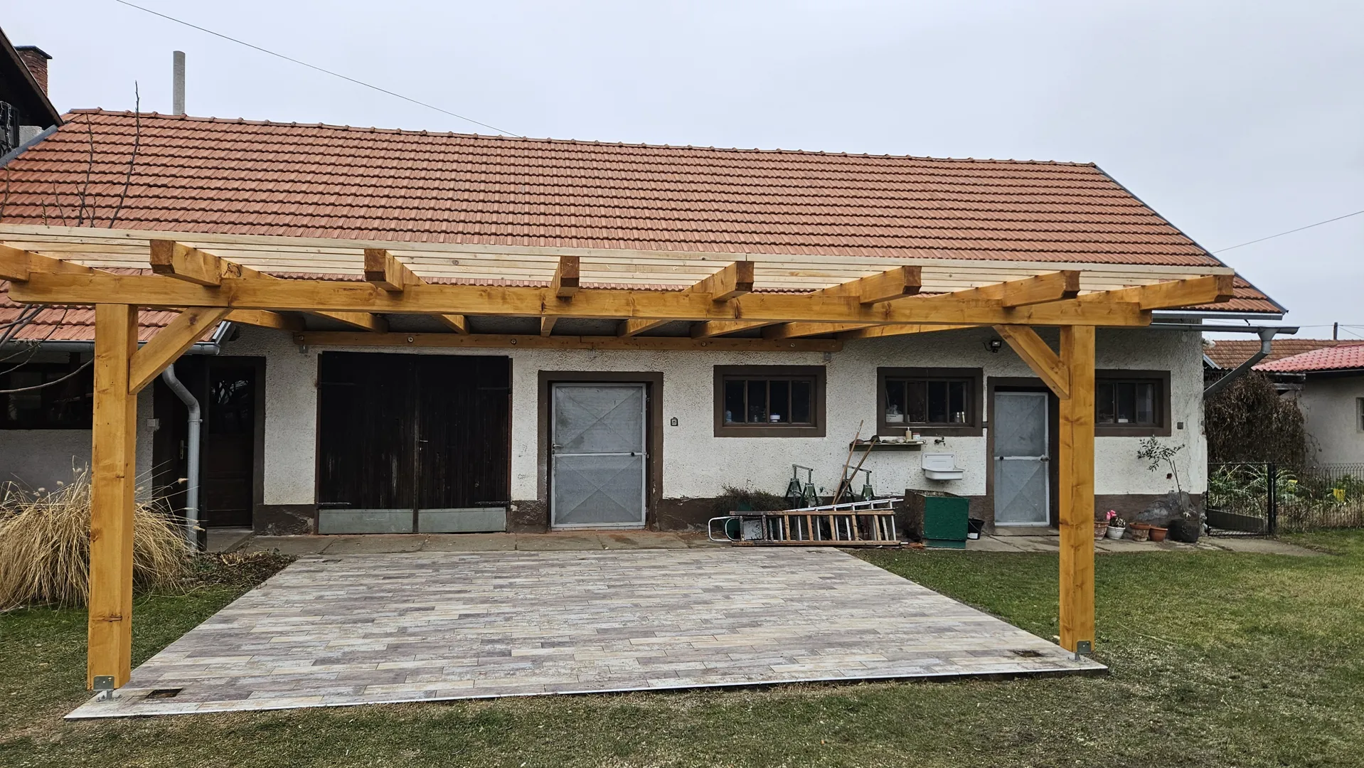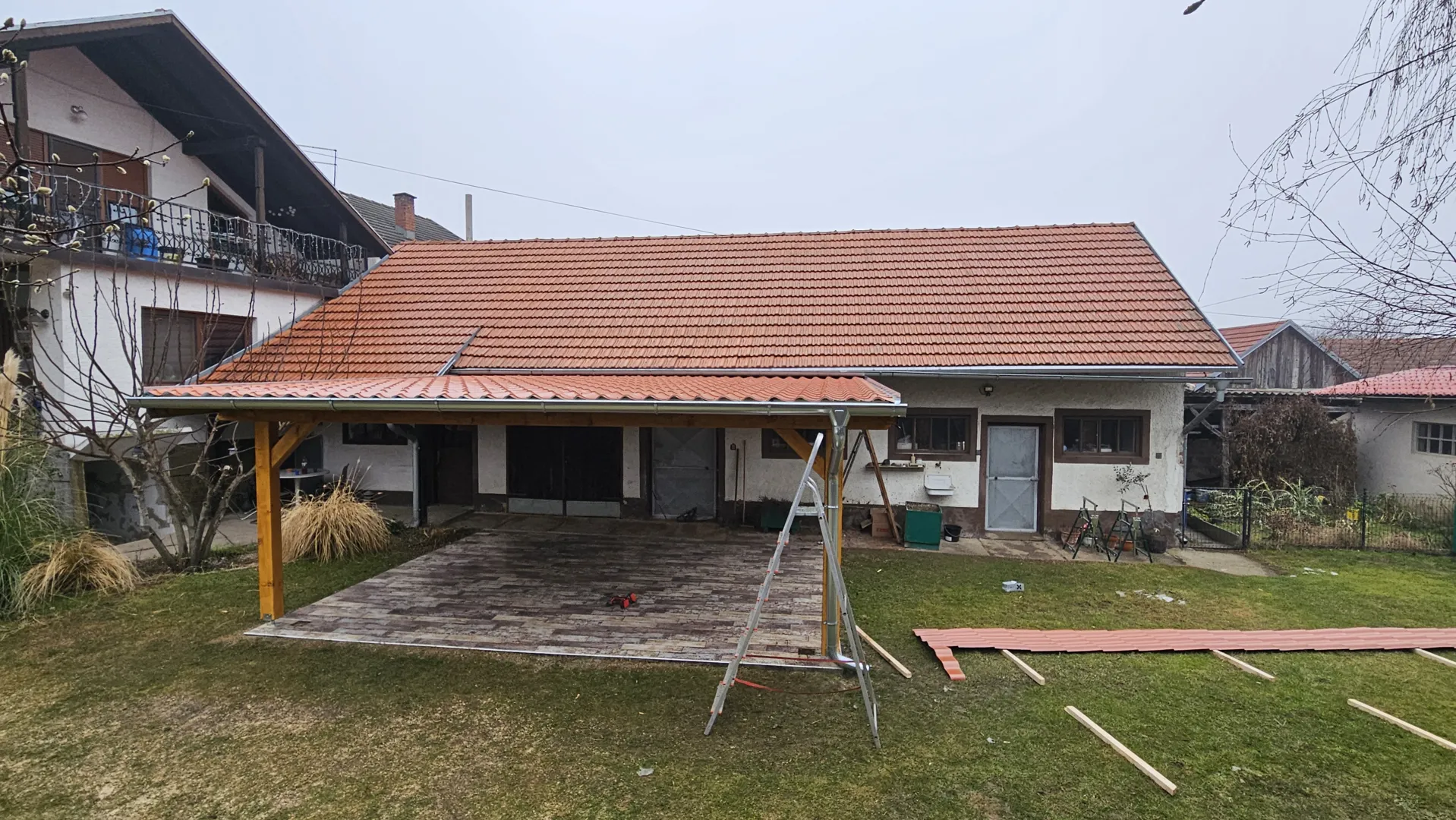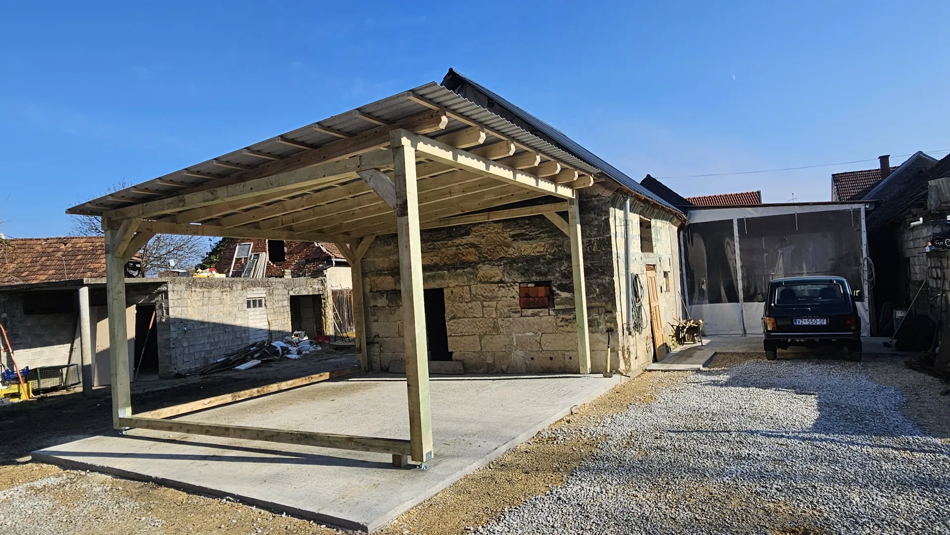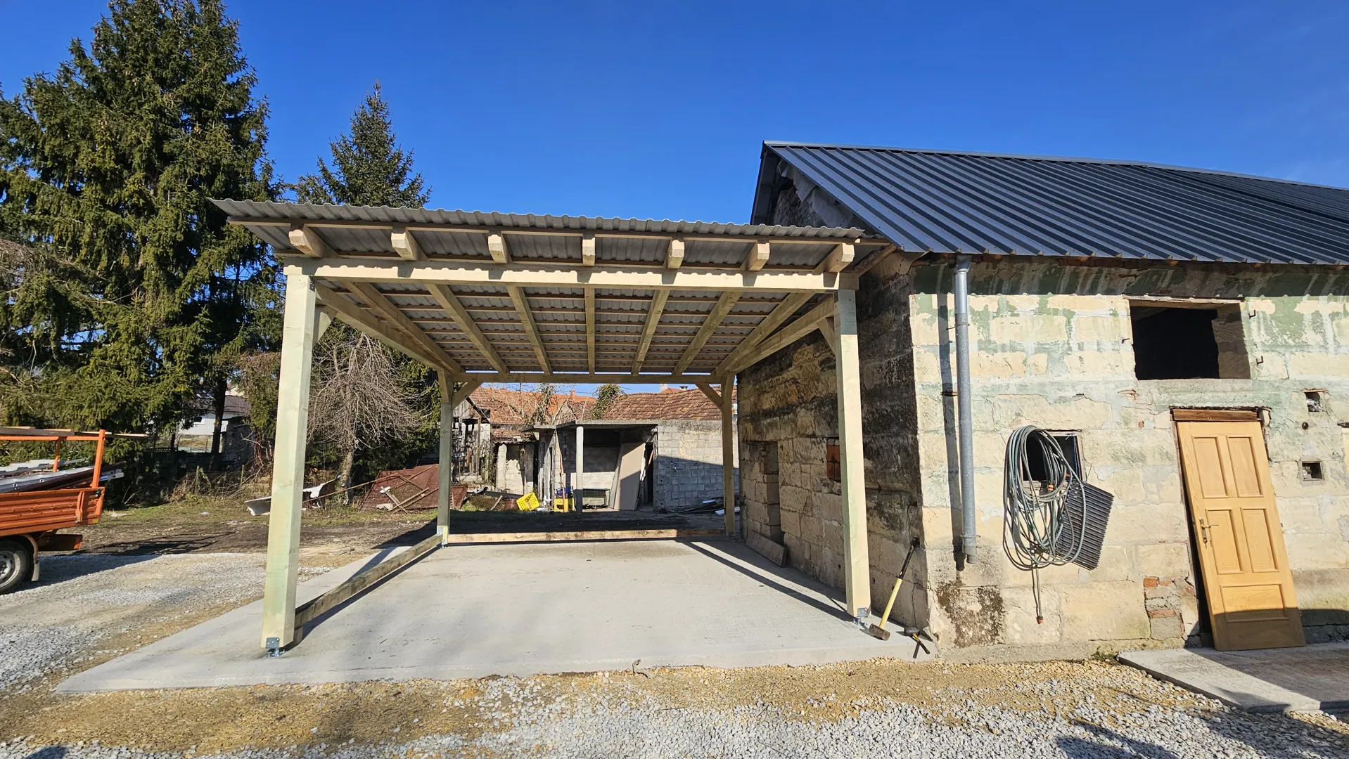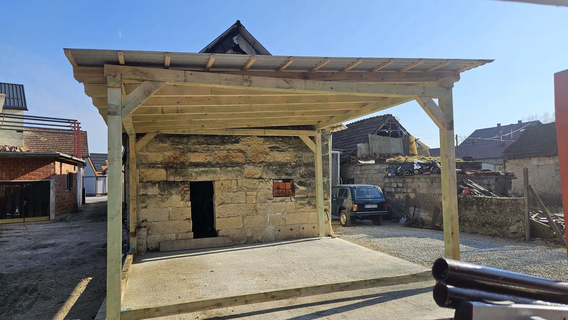 imam već postojeći objekt kao spremište i građevinsku za to. Krovište je na jednu vodu. Dužina svih spremišta, garaže i nadstrešnice je oko 26m, a širina 5m, visina od strane dvorišta 2,5m, a sa druge strane 3,5m. Potrebno je ukloniti postojeće zidove, pripremiti donju ploču i postaviti montažni objekt na to mjesto u približno istim dimenzijama.