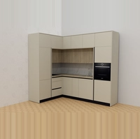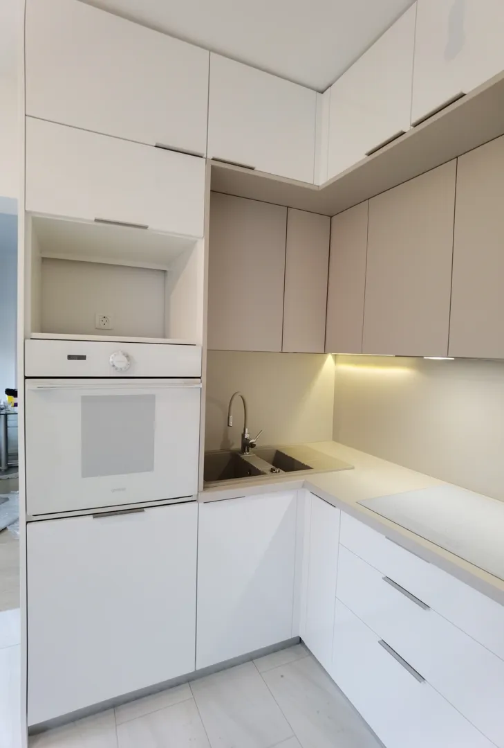 Kuhinja po mjeri. Korpus je bijela iverica 18 mm, a fronte su bijela iverica visoki sjaj. ( Molim Vas također i ponudu sa frontama u mat dekoru - siva). Radna ploča je u crnoj boji kamena ( otprilike kao na slici) i sa kutnim spojem. Leđa su bijeli HDF 3 mm. Donji elementi su na PVC nogicama + cokl u materijalu fronti. Fronte su bez ručkica i napuštene su ispod korpusa za 10 mm za otvaranje. ladice se otvaraju na push. Bez kuhinjskih aparata.