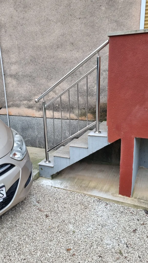 -cca xcm Inox klizna vrata (s bravom) i montažom. -montaža vodilice s valjcima je fasadi stirodur cca 5-7cm -jednostavni izgled ograde okvir (okrugli profili) i vertikalne poveznice -šina i kotač od inoxa