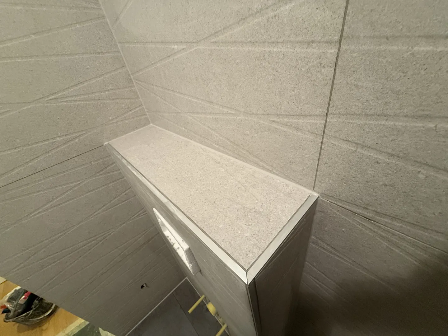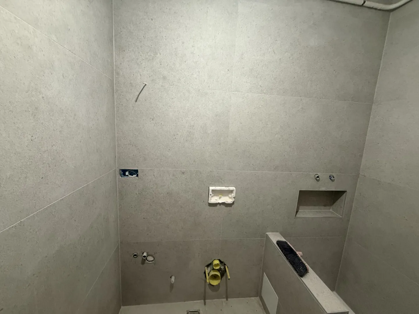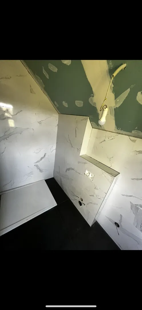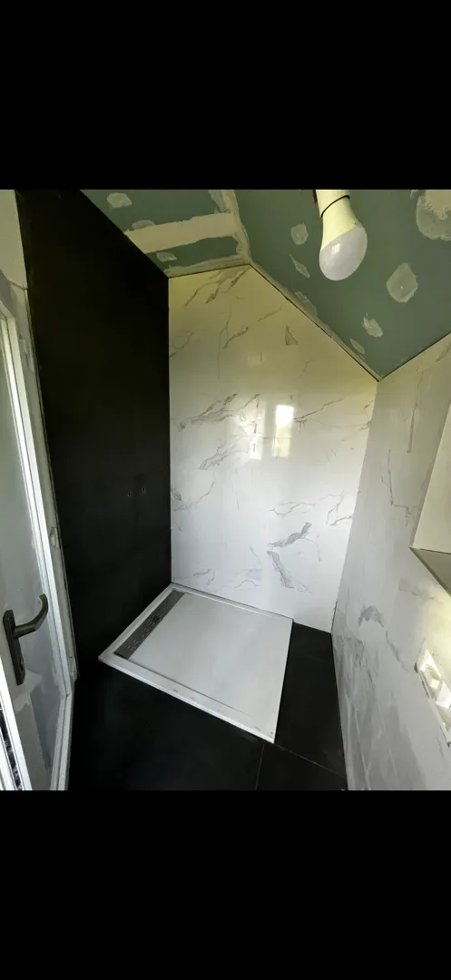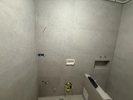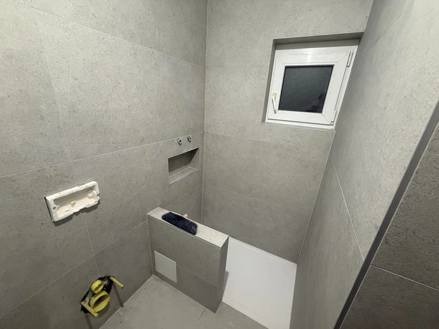 Kupatilo se nalazi u potkrovlju. oblozeno je gips pločama, potrebna je hidroizolacija i obzidavanje kade. pored kade se nalaze dvije police unutar zida. kupatilo je velicine 2.5 x 2.15 m. iza i ispod kade se nebi lijepile plocice. podne plocice su dimenzija 15x60 mm (gresporculan) imitacije drveta, zidne su 25x50 mm imitacija crvenog mramora.