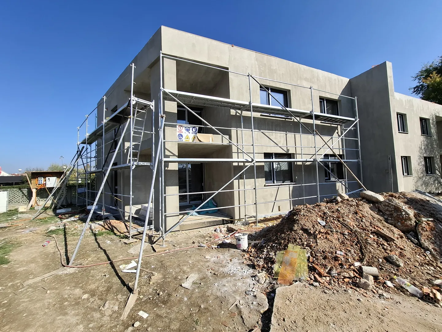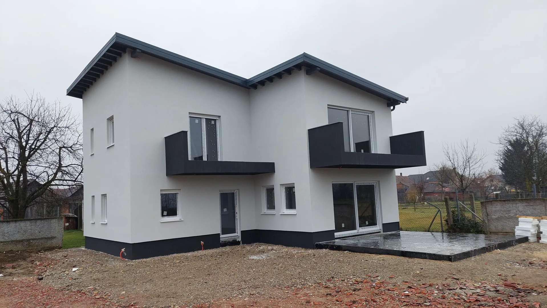 Boja bi bila bijela sa sivim uvučenim dijelovima kao što je balkon i terasa,samo mrežica,gletanje i silikat