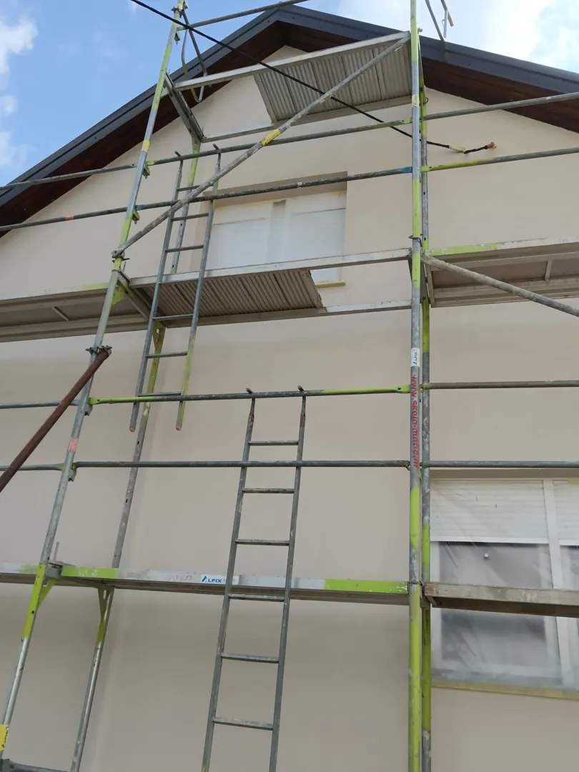 Građevina je stara 35 god. kod renoviranja nova stolarija dio fasade je obnovljen cc 40m2 drugi dio treba popraviti kako bi struktura bila ista ili slična treba pokrpati neobojanu staru fasadu recimo cc 5 m2 ostalo preći premazom i bjelom fasadnom bojom. Radi se o zatvorenom dvorištu gdje su tri zida cc3 m visine dok je četverti cc 6m.
