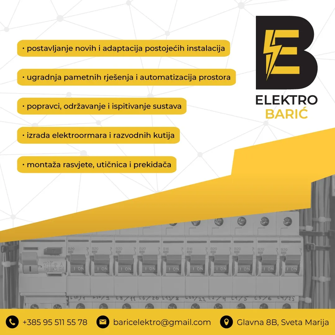 O nama: Elektro Barić d.o.o. pruža pouzdana i moderna elektroinstalacijska rješenja za privatne i poslovne projekte. Specijalizirani smo za izvođenje radova, projektiranje, automatizaciju, inteligentne sustave, telekomunikacije, protupožarne i alarmne sustave te opremanje energetskih postrojenja. Uz realizaciju novih projekata nudimo i servis i održavanje, jer dugoročna kvaliteta i zadovoljstvo klijenata za nas su prioritet.