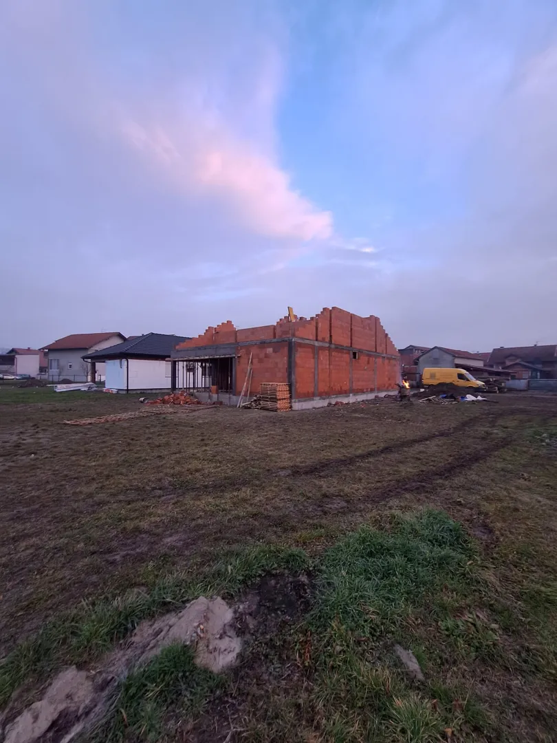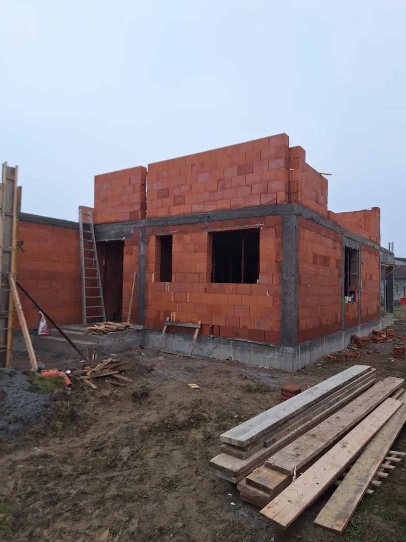 Kuca prizemlje, prvi i drugi kat s kosim krovom. Tri zasebna stana. Prizemlje ca 30m2 prvi i drugi kat po 50m2. Stubiste takodjer. Kuca je s jedne strane ljepljena na susjednu...ostale tri strane su otvorene. Zidane klasicno blokom, prvi kat moguce i beton. Krov ili lim ili crijep zavisno od cijene (krov na dvije vode). Projekt gotov, predato za gradjevinsko dozvolu. Pocetak gradnje moguce na proljece 3-4mj. zavisi kada se odobri gradjevisnka. lp
