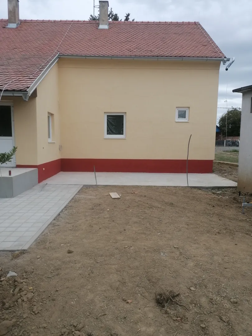 Jednostavno pravokutno postavljanje opločnika oko vikendice. Zbog širine placa pristup mjestu rada odličan, iskop se može vršiti bagerom.