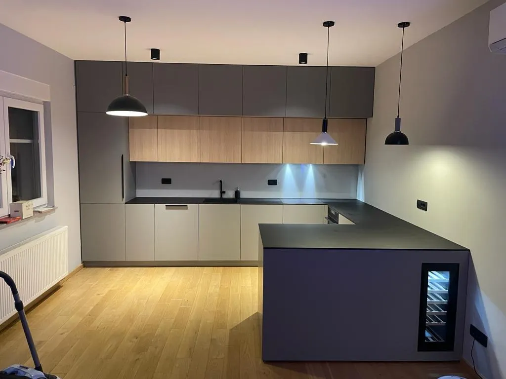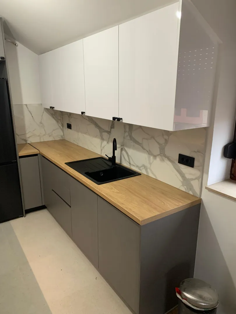 Pozdrav, molim ponudu za izradu kuhinje po mjeri ca 4m dužna u L sa ugradbenom napom ,pećnicom u visokom elementu ,indukcijskom pločom,i sudoperom.Korpus od iverala, a frontovi od MDF ploča svijetle matt boje. LED Rasvjeta ispod gornjih elemenata. Zidni elementi visoki 80 cm. Zidna obloga između gornjih i donjih elemenata, PVC obloga ili slično. Sva vrata i ladice sa stoperima i ručkama, u boji nehrđajućeg čelika. U ćošku se nalazi šaht. Dimenzije u prilogu.Radna ploča Laminat, plastični rub, sa uzorkom svijetlog drveta. Isporuka kraj 12.mj do kraj 1. mj Unaprijed hvala.