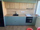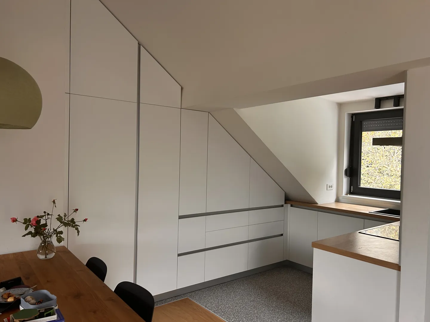 Kuhinja u L, ulazi se sa istočne strane kroz veliki prolaz, zapadni zid je 3,6m, a južni 2,4. Materijal bi bio medijapan sa hpl površinom, mat površinske strukture. Na slici u privitku je sve netočno ucrtano vezano za raspored kuhinje tako da slika služi čisto kao orjentir na oblik kuhinje. I ovaj zid ucrtan zelenom strelicom je udaljen cm od balkonskih vrata.