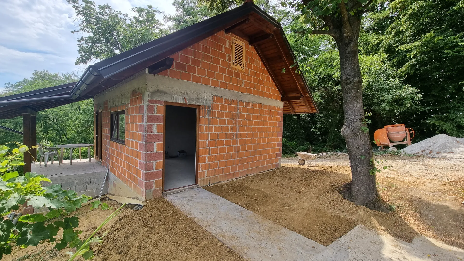 Gospodarski objekt (radiona i vinski podrum) tlocrtne povrsine 40m2. Prva etaza visine 3m, druga etaza visoko potkrovlje. Potrebno je rusenje, odvoz materijala te gradnja novog objekta u istim dimenzijama, visoki roh-bau, fasada, kroviste, instalacije, fasada. Prizemlje novog objekta ce sluziti za stanovanje (sp soba, kupaonica te dnevnasoba/kuhina). Prvi kat ostaje bez pregradnih zidova, za spremiste.