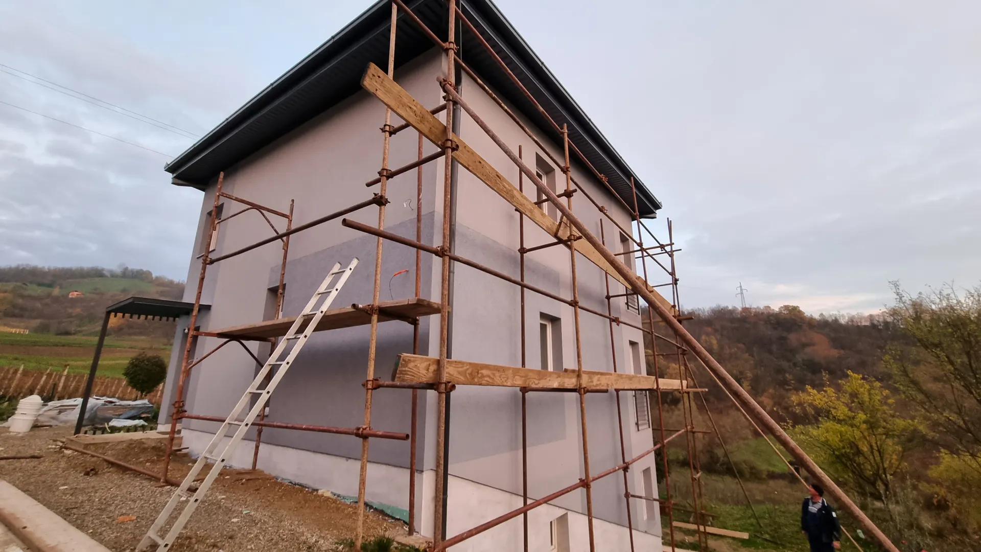 Adaptacija stare kamene kuće - vikendica - vanjskih dimenzija 5.95 x 6,5 m visine do vijenca 6,9 m (unutarnje dimenzije 5.7x 4.7 oko 27 m2), poluugrađena kuća (1 zid zajednički) s prizemljem, 1. etažom i potkrovljem. Trebamo potunu adaptaciju: zamjena drvenih greda s 2 armirane betonske ploče, novi krov (nove grede, novi crijep) s izloacijom možda 1 krovni prozor, skidanje postojeće fasade i stavljanje nove, unutarnji zidovi (skidanje postojeće žbuke hidroizolacija i nova unutarnja žbuka, nove kupaonice u prizemlju i na 1. etaži u kojima je i wc, izmjena postojeće stolarije (prozori i vrata), postavljanje klima uređaja na sve 3 razine, postavljanje pločica te laminata na 1 etaži i u potkrovlju, unutarnje stube s 1 etaže na potkrovlje. U dvorištu pražnjenje septičke jame, dezinfekcija i zatrpavanje, oborinske vode uređenje- oluci i odvodnja, urediti dvorište (popločiti).
