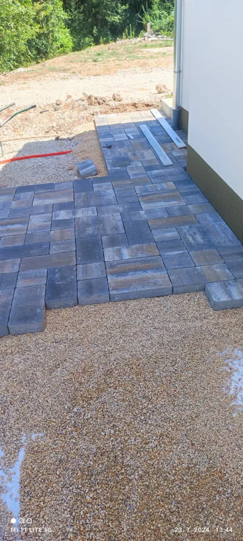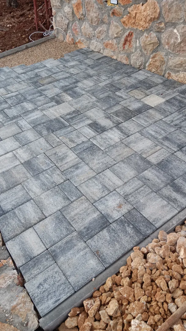 Popločavanje dvorišta Betoniranje temelj - 4 kom cca 60x60x60 cm za andstresnicu. Uređenje dvorišta Oplatne ploče, šalovanje. dobavu tlakovca i popločavanja, te izradu tamponske podloge do 50 cm debeljine.