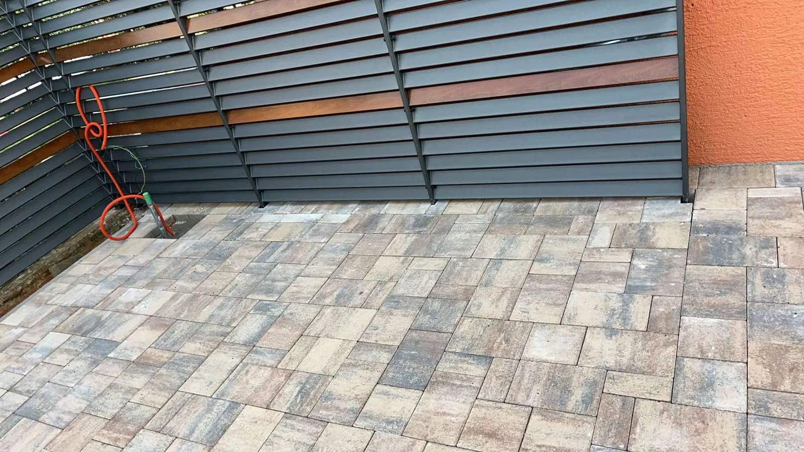Radi se o travnatom dvorištu u uzdignutom prizemlju. Uz djelomično pomičnu ogradu dvorišta je moguće doći kombijem/kamionom. Opločnici se postavljaju u obliku pravokutnika od cca 12 m2 i dugljastog putića od cca 8 m2.