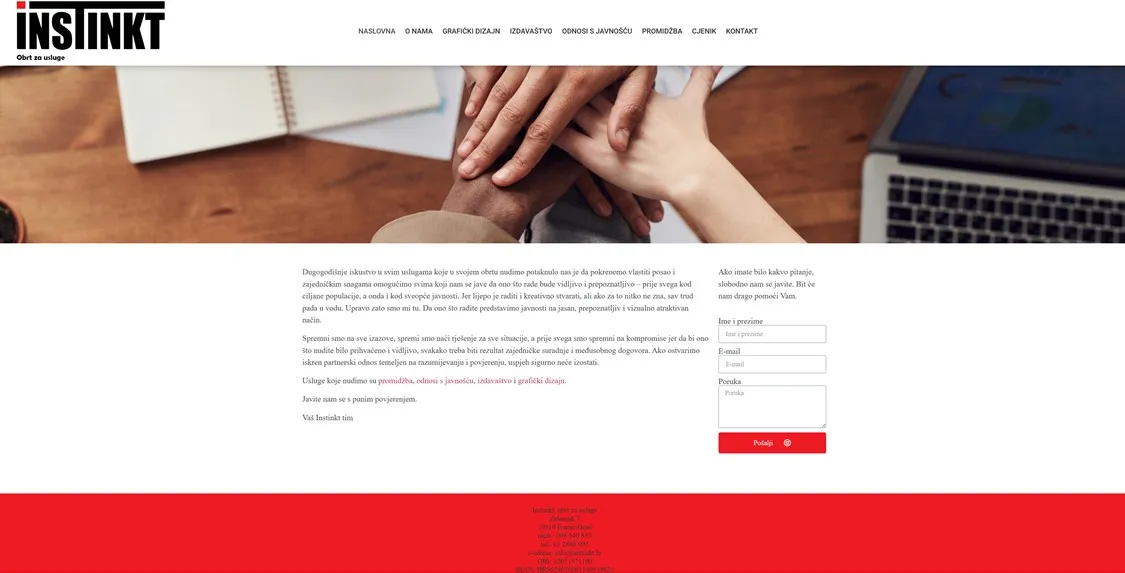 O nama: Preko 20 godina iskustva u svim uslugama koje u svojem obrtu nudimo potaknulo nas je da pokrenemo vlastiti posao i zajedničkim snagama omogućimo svima koji nam se jave da ono što rade bude vidljivo i prepoznatljivo – prije svega kod ciljane populacije, a onda i kod sveopće javnosti. Usluge koje nudimo su odnosi s javnošću, izdavaštvo, grafički dizajn i promidžba s naglaskom na izradu web stranice jer upravo su web stranice osobna karta Vašega poslovanja. Javite nam se s punim povjerenjem.