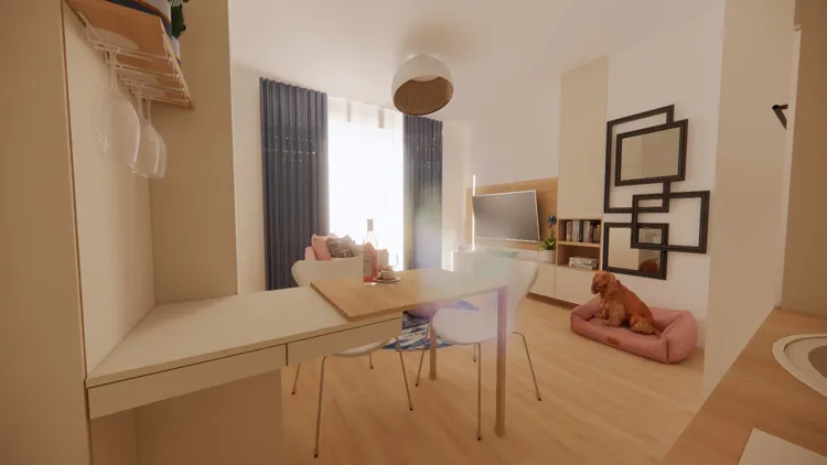 Poštovani, zanima me idejno rješenje uređenja prostora dnevnog boravka, blagovaonice i kuhinje u jednom prostoru, ukupne površine 15 kvadrata. Kuhinja je fiksna te se njezina pozicija ne mijenja. Želimo da ovaj mali prostor bude funkcionalan, a da djeluje prostrano. Preferiramo skandinavski i minimalistički stil.