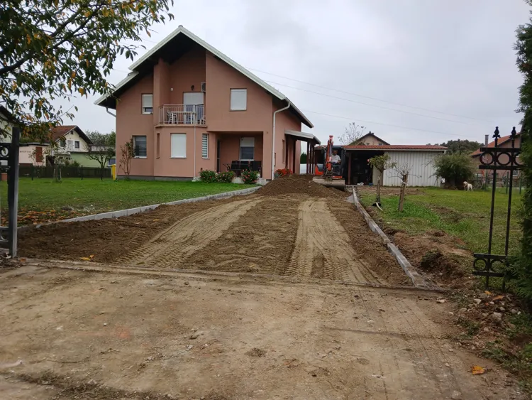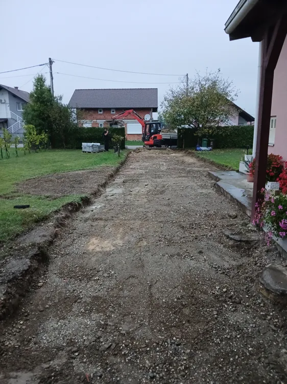 ISKOPATI I ODVESTI BETON I ZEMLJU IZ DVORISTA. POSTAVITI RUBNJAKE 12M, POSTAVITI 3M KANALICA GEOTEKSTIL IKAMEN NABITI I ASVALT POSTAVITI UVALJAN 5 CM..