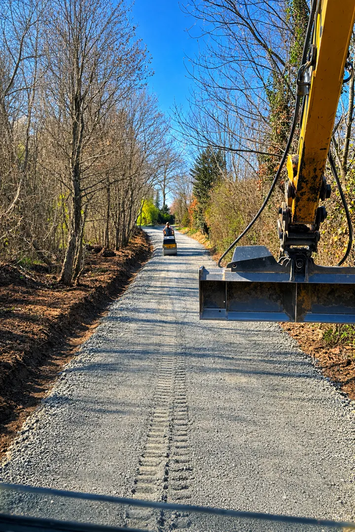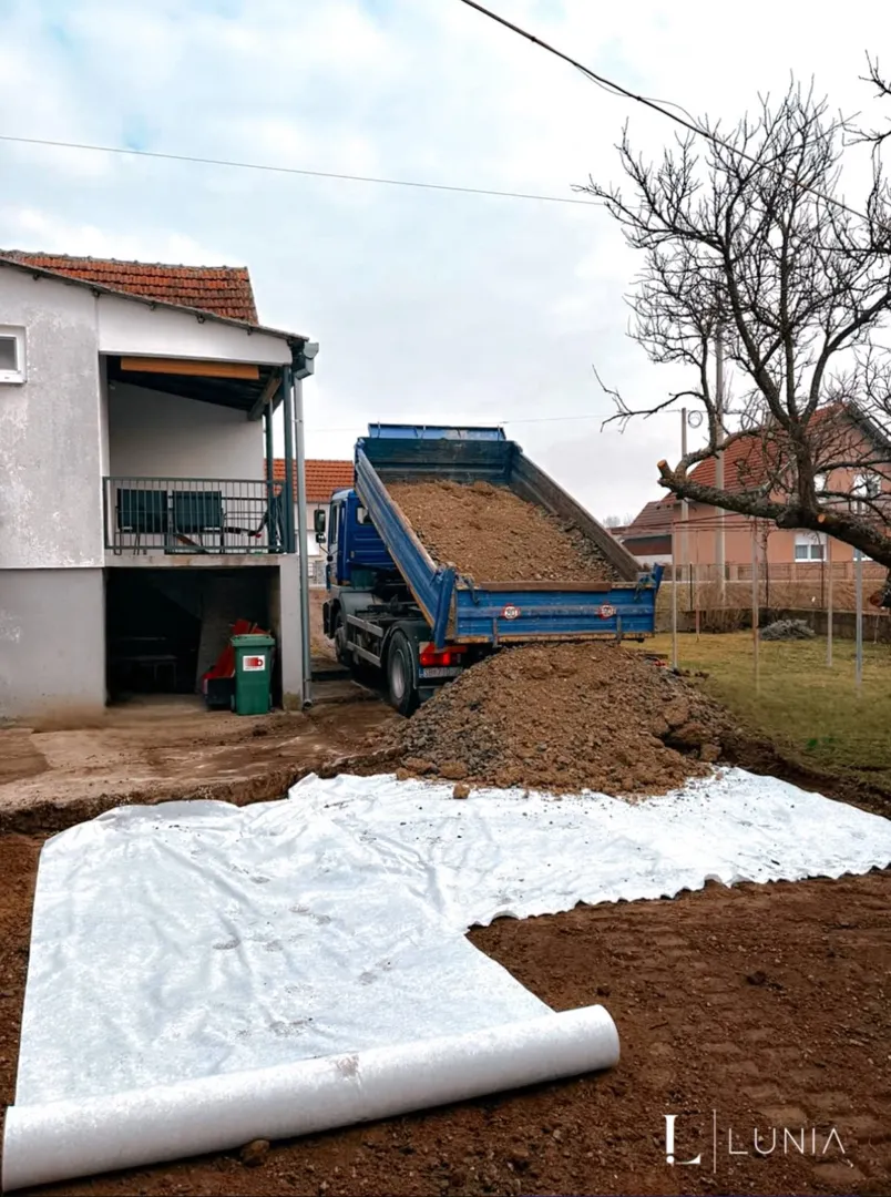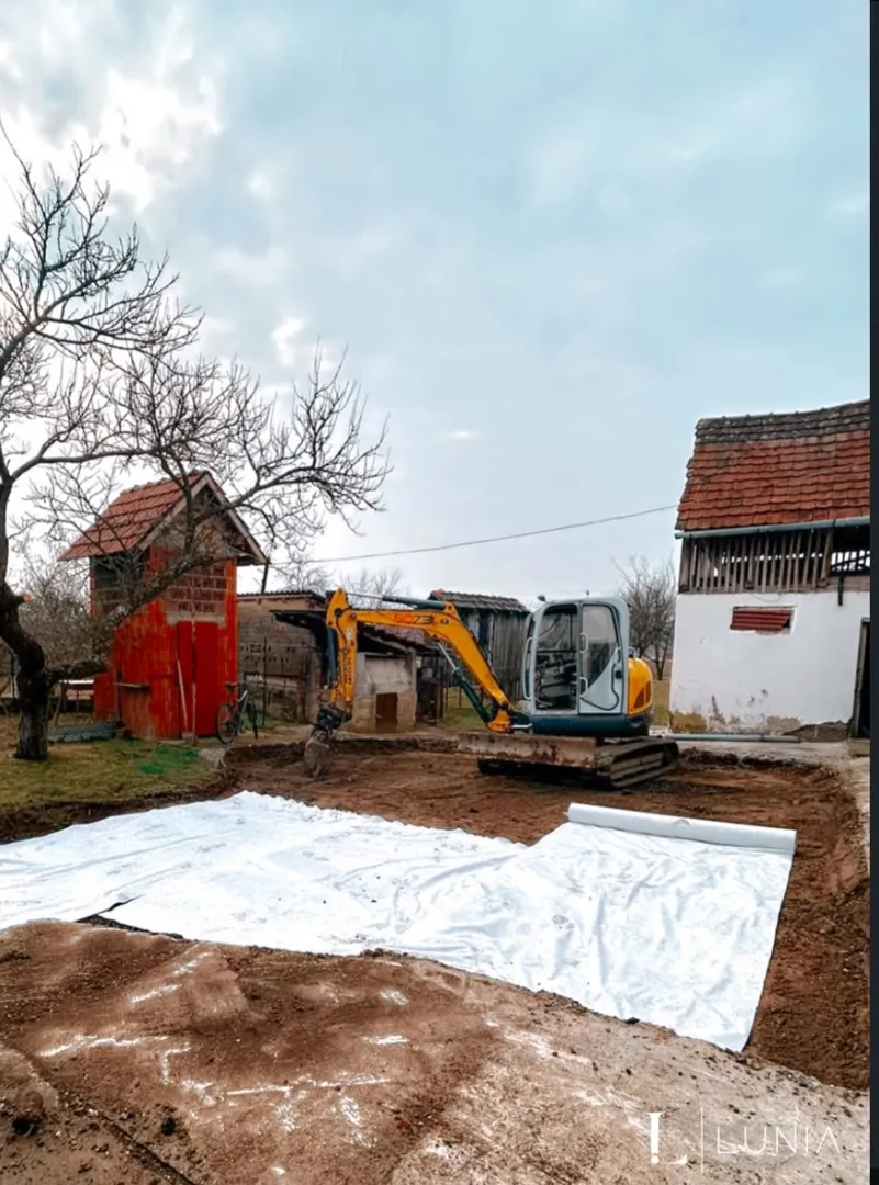 Uz samu kuću potrebno je izvršiti iskop otprilike m3 i isti materijal prebaciti 20-30 metara dalje,ravnomjerno ga nanijeti i poravnati da može poslužiti kao prilazni put do kuće..