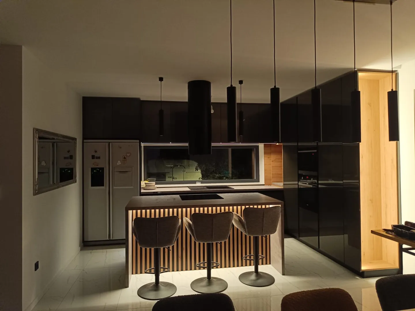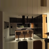 Vizualno gledano, kuhinja bi trebala napravljena slično priloženim vizualima koji su napravljeni prema klasičnom funkcijskom razmještaju od strane arhitekta. Što se tiče boja, za vanjske frotne bi bila idealna neka zelena nijansa (materijal MDF mat, sa dodatnom zaštitom od otisaka), radna ploča kao i površina šanka te zidna obloga iznad radne površine su zamišljene da budu od kvarca (antracit nijansa -polirane da bude sjaj efekt). Kvarc ploče su samo orginalna zamisao što je podložno kompromisu ako bude prezahjtevno za izvesti.
