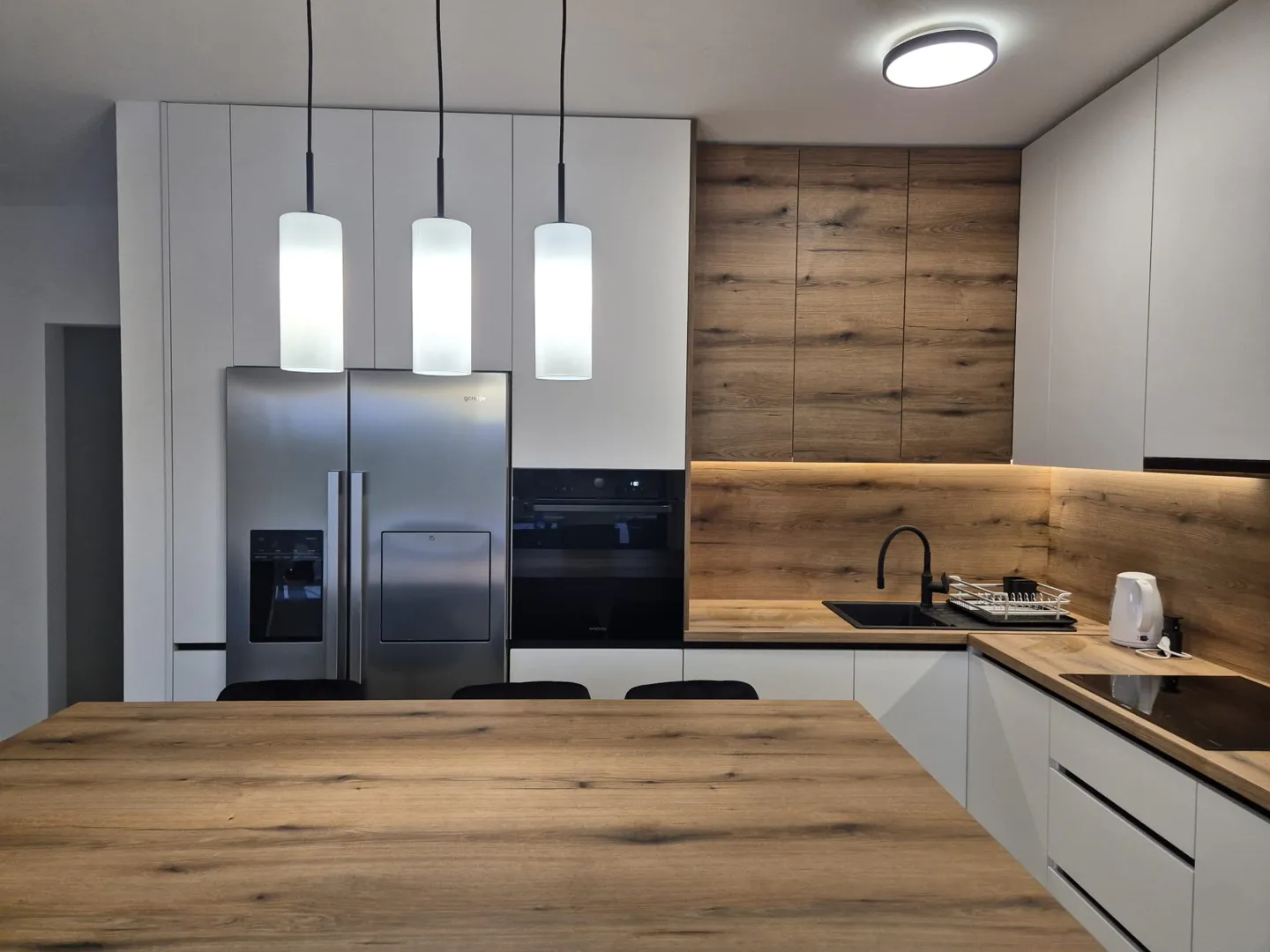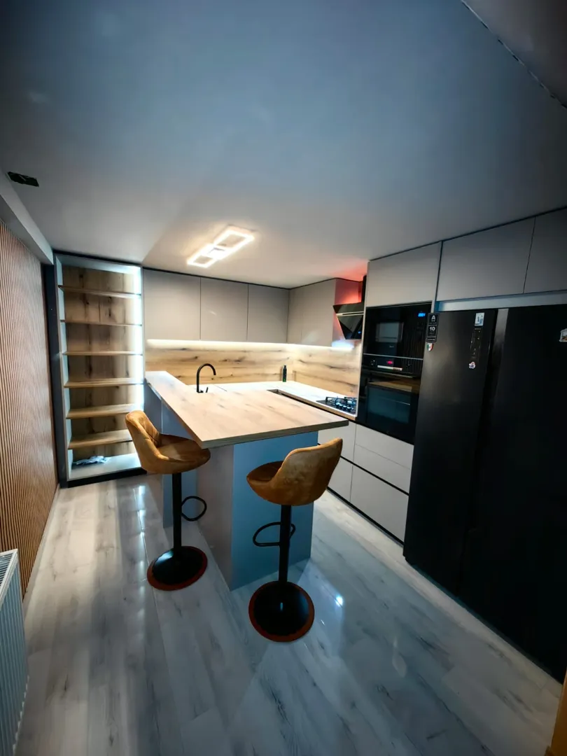 Kuhinja uz zid dugačka je cm, dubine 60 cm, a visina stropa iznosi cm. Preko puta planiran je poluotok duljine cm i dubine 60 cm. Fronte unutarnjih gornjih ormarića (plićih, dubine 30 cm), svih ladica te vanjskih stranica poluotoka izradit će se od iverala Saba Green MN – 19 mm (Iverpan), dok će vanjski gornji ormarići (dublji, 60 cm) biti od iverala Kristalno Bijeli MN – 19 mm (Iverpan). Radna ploča na elementima uz zid i na poluotoku bit će ili Kvarc Ocean Lagoon (Iverpan) ili radna ploča Orah Tortona AN – mm (Iverpan), pa molim ponudu za obje opcije. Sve ladice trebaju imati amortizirajuće zatvaranje (soft-close), a isto vrijedi i za ostale fronte. Kombinirani hladnjak će biti ugradbeni. Za sudoper detaljnije piše u pdf privitku. Koristit će se indukcijska ploča u kuhinji za koju je potreban otvor. Točne pozicije utičnica šaljem u privitku. Otvor za napu nalazi se u kutu gore desno, a napa će biti postavljena skroz lijevo, tako da je potrebno u gornjim elementima predvidjeti prolaz za odvod od nape. Na zid između donjih i gornjih elemenata planira se keramička obloga, koja će biti izvedena prije montaže kuhinje. U sklopu poluotoka planiran je otvor za ugradbenu mikrovalnu pećnicu, a na njegovom kraju, bliže hladnjaku, planira se smještaj vinskog hladnjaka. U podu se već nalazi električni izvod koji bi trebao napajati mikrovalnu, vinski hladnjak i još tri dodatne utičnice na samoj površini poluotoka (zaklopne ili rotirajuće utičnice), za priključivanje manjih uređaja poput miksera, blendera ili punjača. Molim ponudu s uključenom montažom i jasno specificiranim stavkama prema elementima, materijalima i radu. Napomena: U privitku _kuhinja 1,2 gledati samo lijevu opciju jer je desna opcija samo s jednim ormarićem iznad kuhinje dubine 30cm, a tu opciju ne želimo.