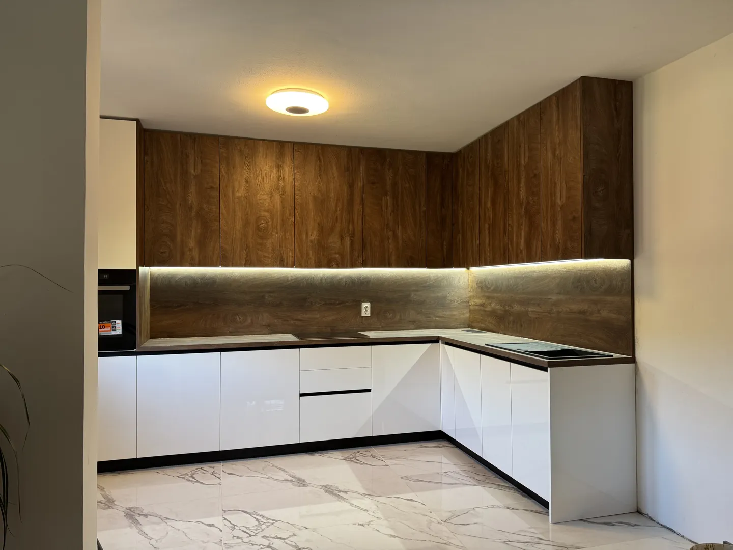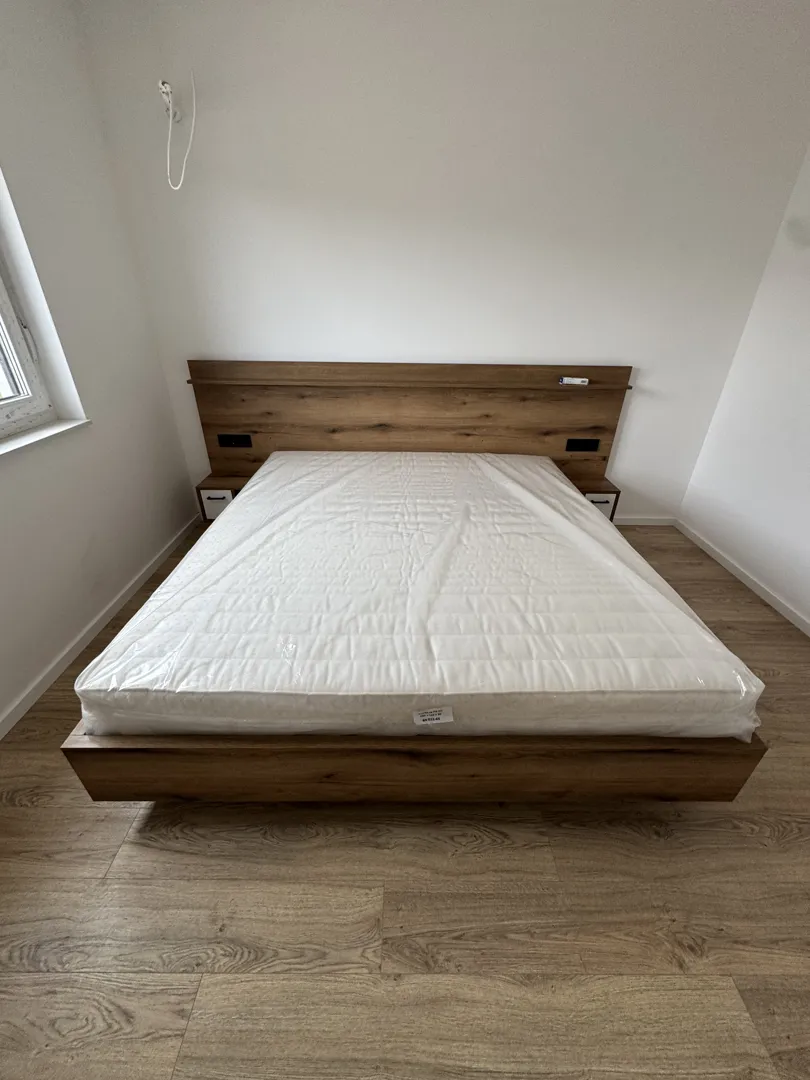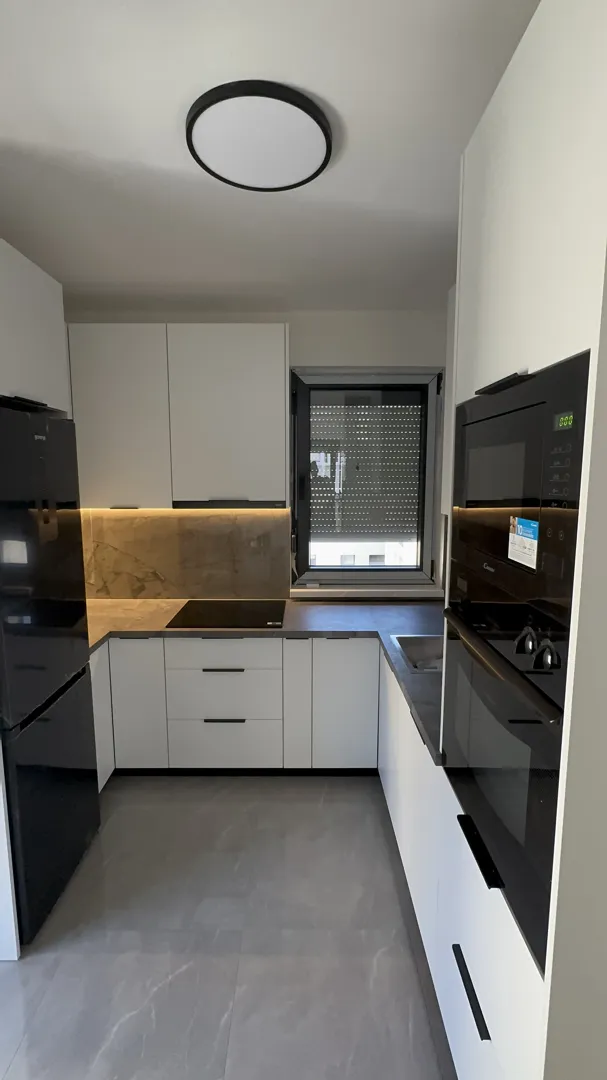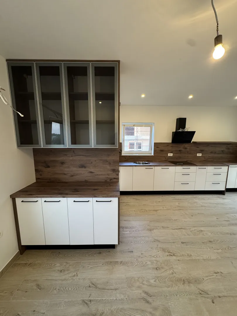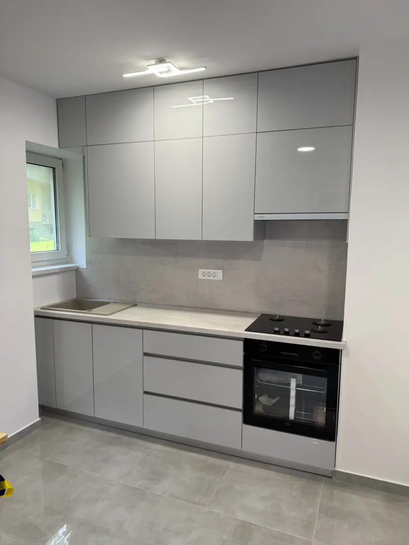 Kuhinja po mjeri L oblik. Jedan krak 2 m (sudoper korito+lim za cjeđenje, pećnica+ploča +napa, element do kuta) sve sa gornjim elementima. Drugi krak je bez gornjih elemenata i ide veza iz kuta ispod prozora do drugog zida 2 m samo donji elementi visine 87 cm i do njih visoki stajaći frižider 60 cm. Korito inox jednodjelno+lim za cijeđenje. Napa sa filterom bez odvodnih cijevi. Boja kuhinje tamno bijela (bež). Boja radne ploče siva imitacija mramora. Svi elementi završnog sloja visoki sjaj. Materijal kuhinje 1,8-2,0 cm. Materijal radne ploče mediapan. Molim ponudu sa uređajima, dostavom i montažom. Plaćanje gotovinom. Rok izrade 2-3 mjeseca.
