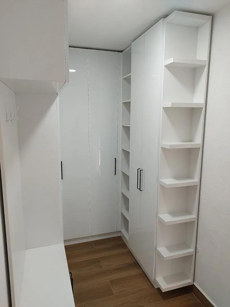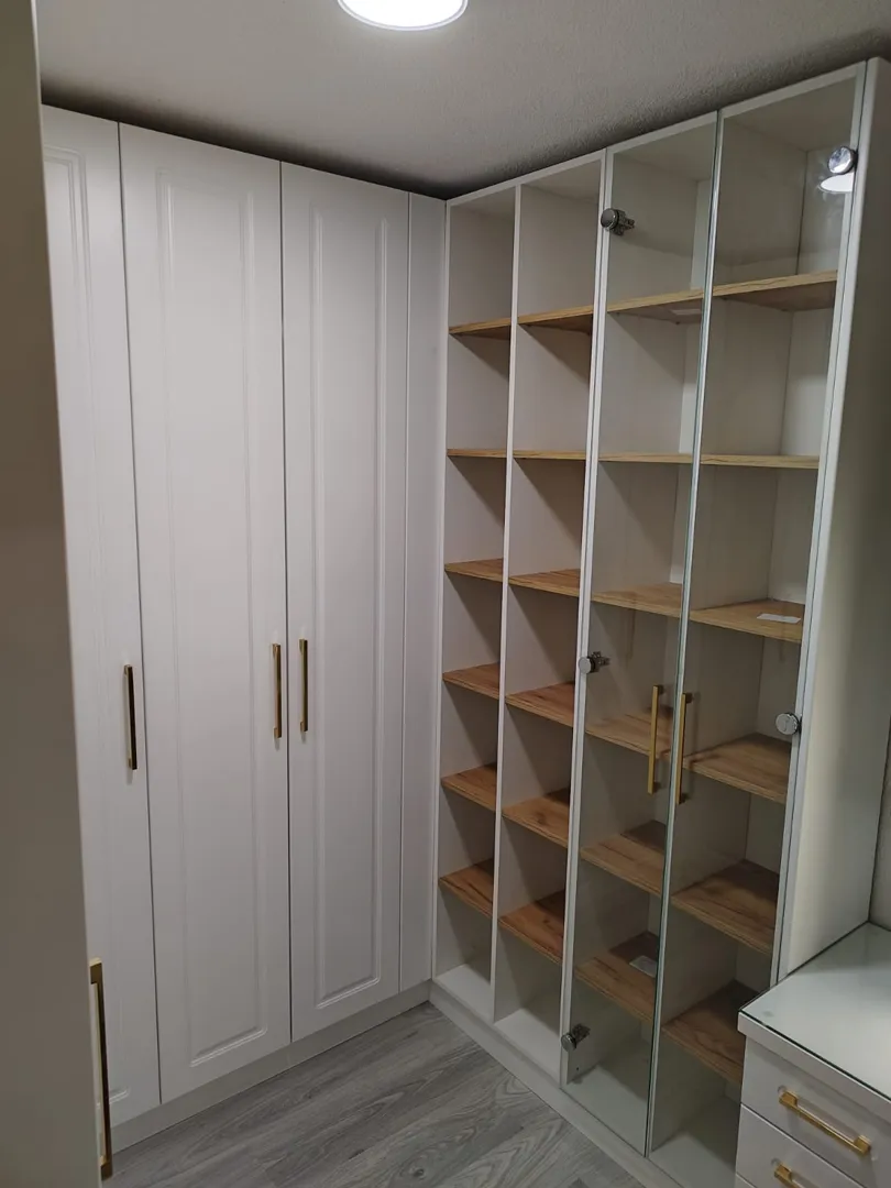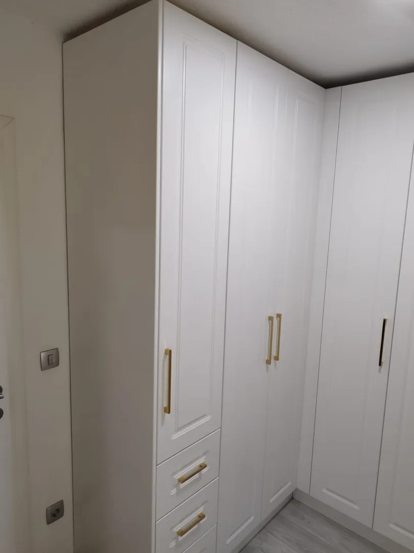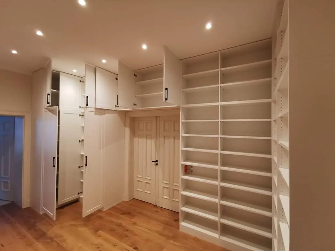 Poštovani. trebam garderobni ormar dimenzija: visina cmx dužina cmx dubina 64 cm + dio iza vrata koji je manje dubine: visina cm x dužina 89 cm x dubina 47 cm. Ormar bi trebao biti podijeljen na 5 dijeova. 1. dio iza vrata bi trebao imati 6 polica (x89x47) 2.dio širina 90 cm; 6 polica 3.dio širina 90 cm; 2 police u gornjem dijelu, prostor za vješanje i 2 ladice u donjem dijelu 4.dio širina 90 cm; 2 police u gornjem dijelu i prostor za vješanje 5.dio širina 65 cm; 2 police u gornjem dijelu i prostor za vješanje Ormar bi trebao biti sa kliznim vratima u bijeloj boji. Očekujem Vašu ponudu.