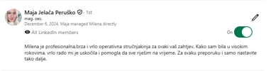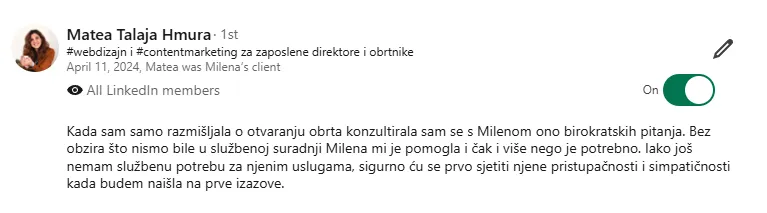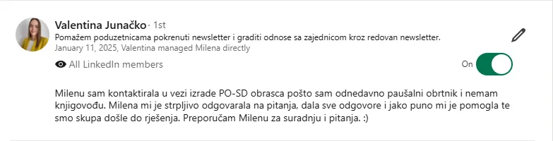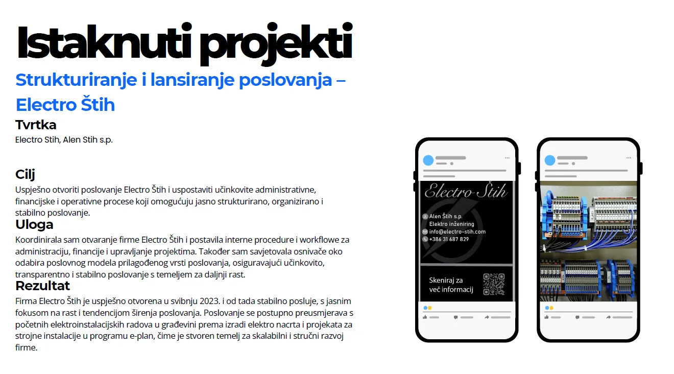 O nama: Gubite vrijeme na račune, uplate, knjigu prometa, blagajnu, pritišću Vas rokovi? Brinu Vas porezi, obrasci i doprinosi? Umjesto da se bavite svojim klijentima stalno rješavate papirologiju i provjeravate obaveze? Moje rješenje: pružam online a po potrebi i offline knjigovodstvene i administrativne usluge za sve paušalne obrte, coacheve, edukatore, dizajnere, programere, VA, fotografe i zanatske obrte. Preuzimam financije i administraciju, a Vi se fokusirate na svoj biznis.