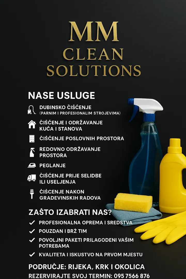 O nama: MM Clean Solutions nudi čišćenje stanova, kuća i poslovnih prostora, generalna i dubinska čišćenja, održavanje prostora, pranje prozora i roleta te čišćenja nakon renovacija i useljenja. Pouzdani, temeljiti i fleksibilni – vaš prostor zablista uz nas!💫