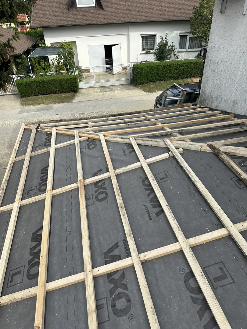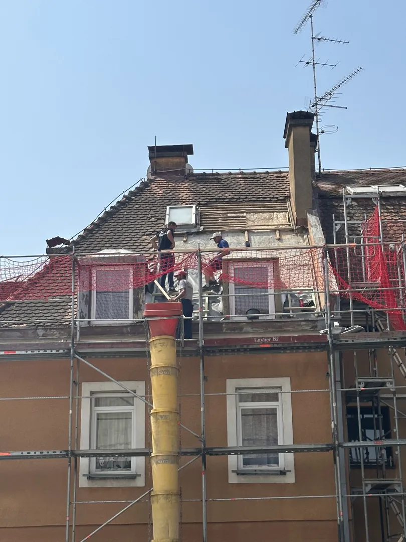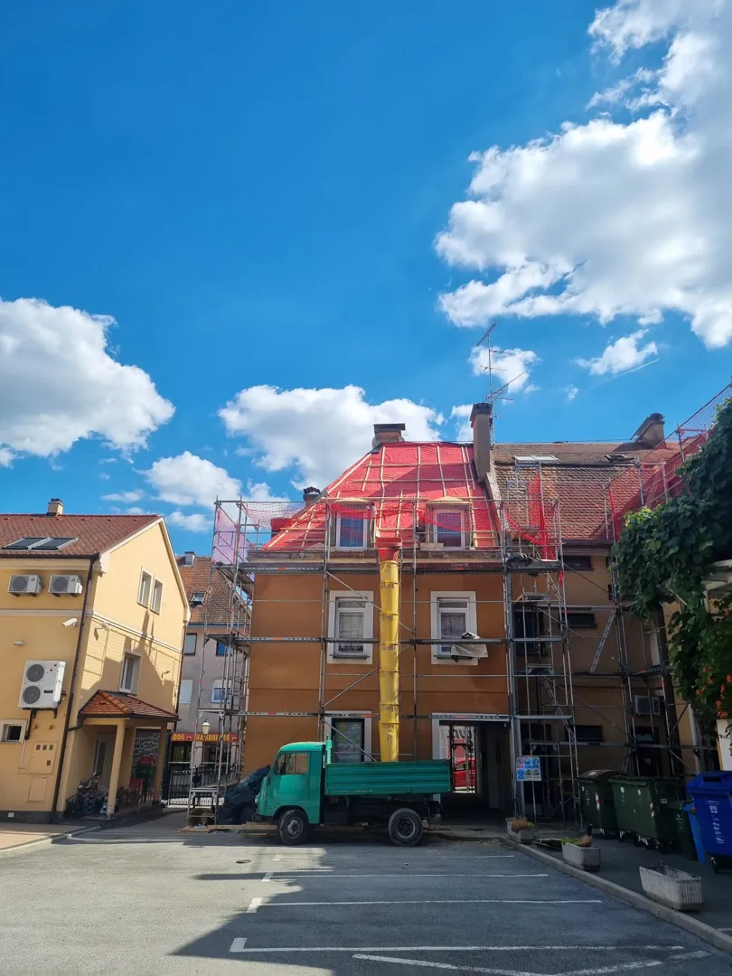 Demontaža postojećeg krova (salonit ploče), postavljanje toplinske izolacije na postojeće stropne grede sa svim zastitnim folijama i daskanjem (daska ili osb ploča). Postavljanje novih rogova sa svim pripremama za metalni pokrov (imitacija crijepa). Sve potrebne limarske radove za odvod vode sa krovista. Zgrada sastoji od prizemlja i dva kata i nalazi se u Zagrebu (Dubrava).