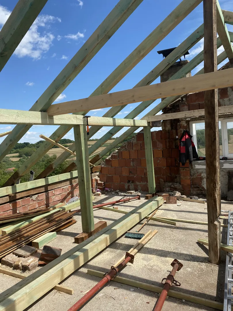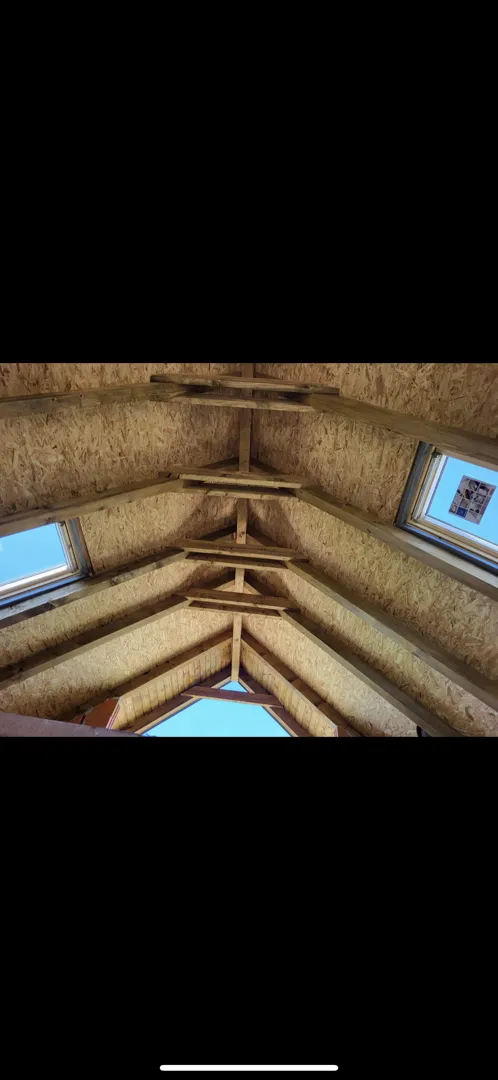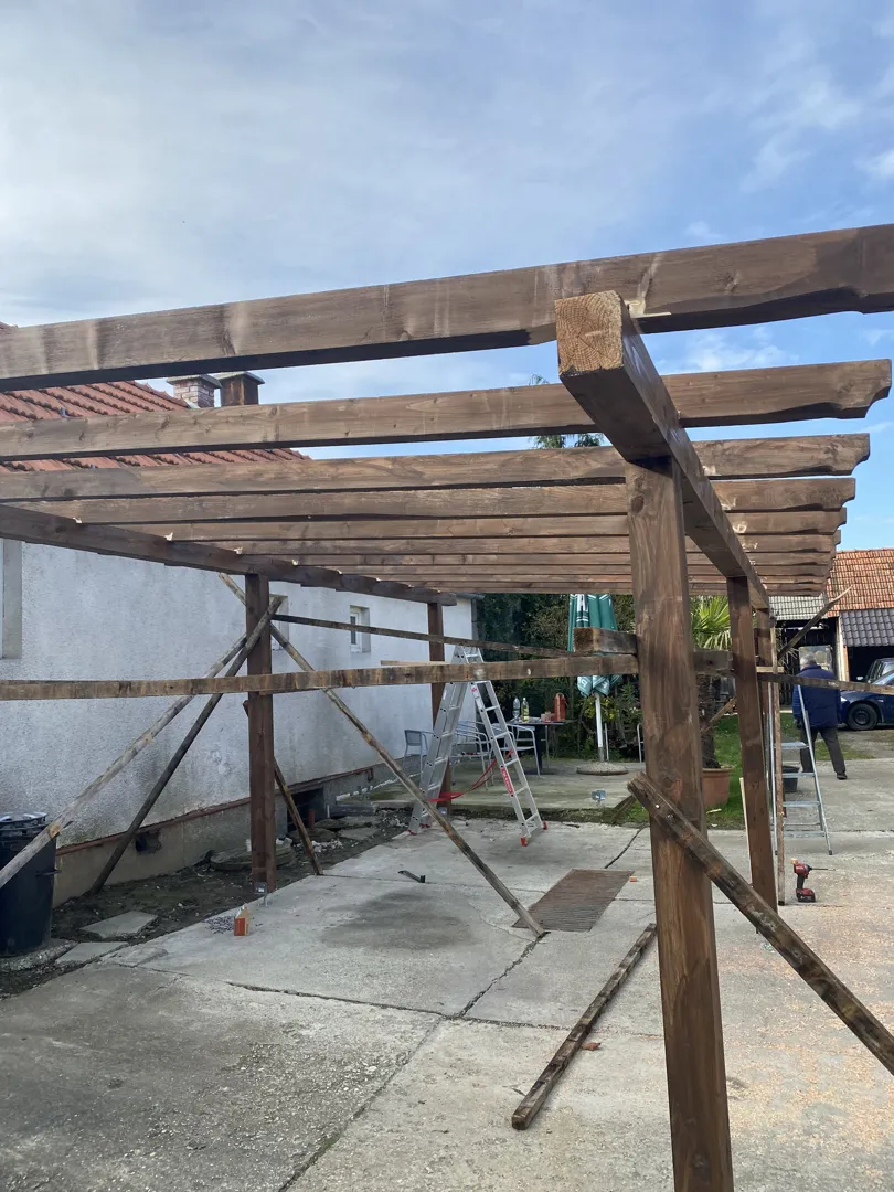 Objekt je 5,5x7,5 .zidanje nadozida 0,80m i zatvaranje čela.U lijevom otvor fi a u desnom nadozid 0,50 i dvije ab grede 0,25 nagiba 35 stupnjeva..izrada nove krovne konstrukcije 35 stupnjeva s napustima oko 0,80m. Podaskati,staviti foliju skytech,kontra letve ,letve i crijep.Crijep tondah tamno crveni glazirani sa ozračnicima ,snjegobranima završni rubni crijep.krovište premazati zaštitnom lazurom u sivoj boji.Oluci,veter lajsne limarija u tamo sivoj boji.