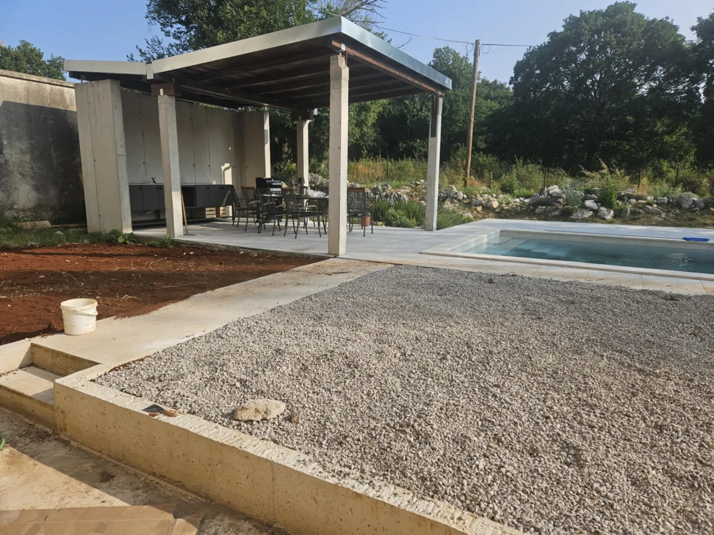 Za projekt uređenja okućnice od cca m2, potrebno je: a) dizanje ranije postavljenih tlakavaca i njihovo premještanje na istom terenu b) iskop kanala za polaganje dovoda i odvoda vode, te strujnih kabela (ili samo bužira) sa jednog kraja terena na drugi c) skop, šalovanje i betoniranje sidra za nadstrešnicu (5 stupova) i sidra za igralo (komplet dvije ljuljačke, tobogan, kućica) d) iskop zemlje i priprema za stavljanje tlakavaca na drugom dijelu terena...