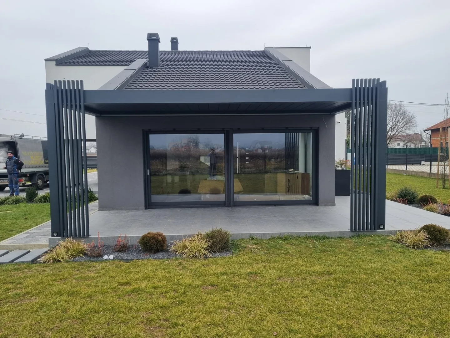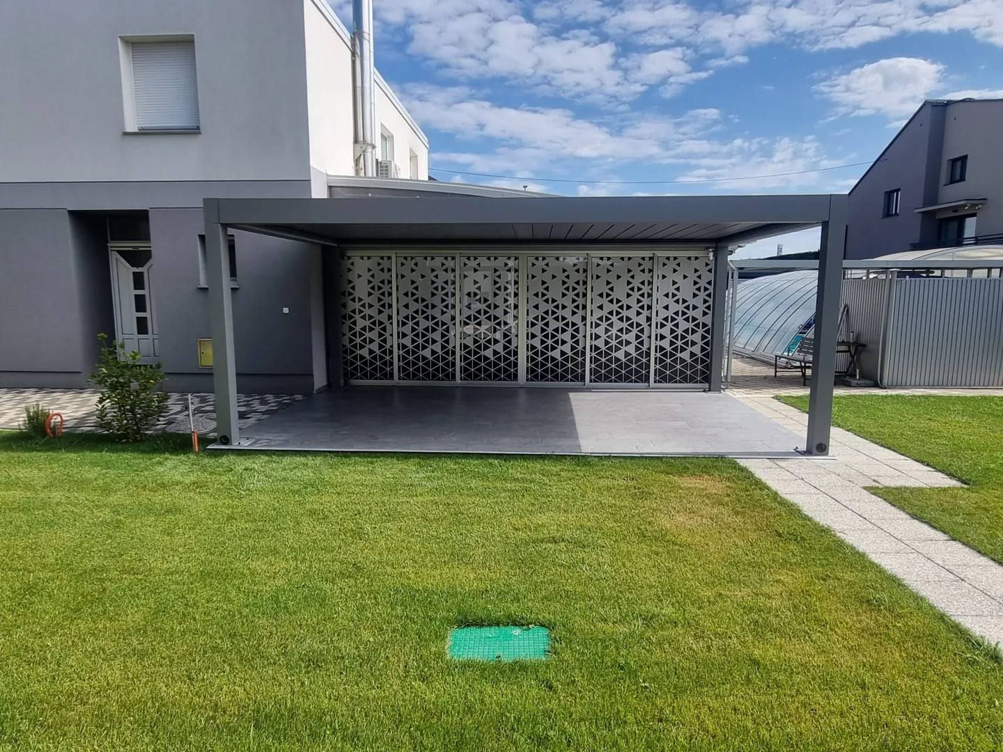 Poštovani, na Krku bih napravio metalnu nadstrešnicu (toplo pocinčano i antracit). Nadstrešnica je fiksirana s jedne strane u škarpi, opcionalno i s druge strane u kući. Krov će biti ravan, možda folija ili neko drugo rješenje. U lijevom dijelu zatvorio bih nadstrešnicu (drvena konstrukcija), gdje bismo imali prostora za uklanjanje vrtnog namještaja, bicikala i slično. Stojim vam na raspolaganju za sve dodatne informacije.