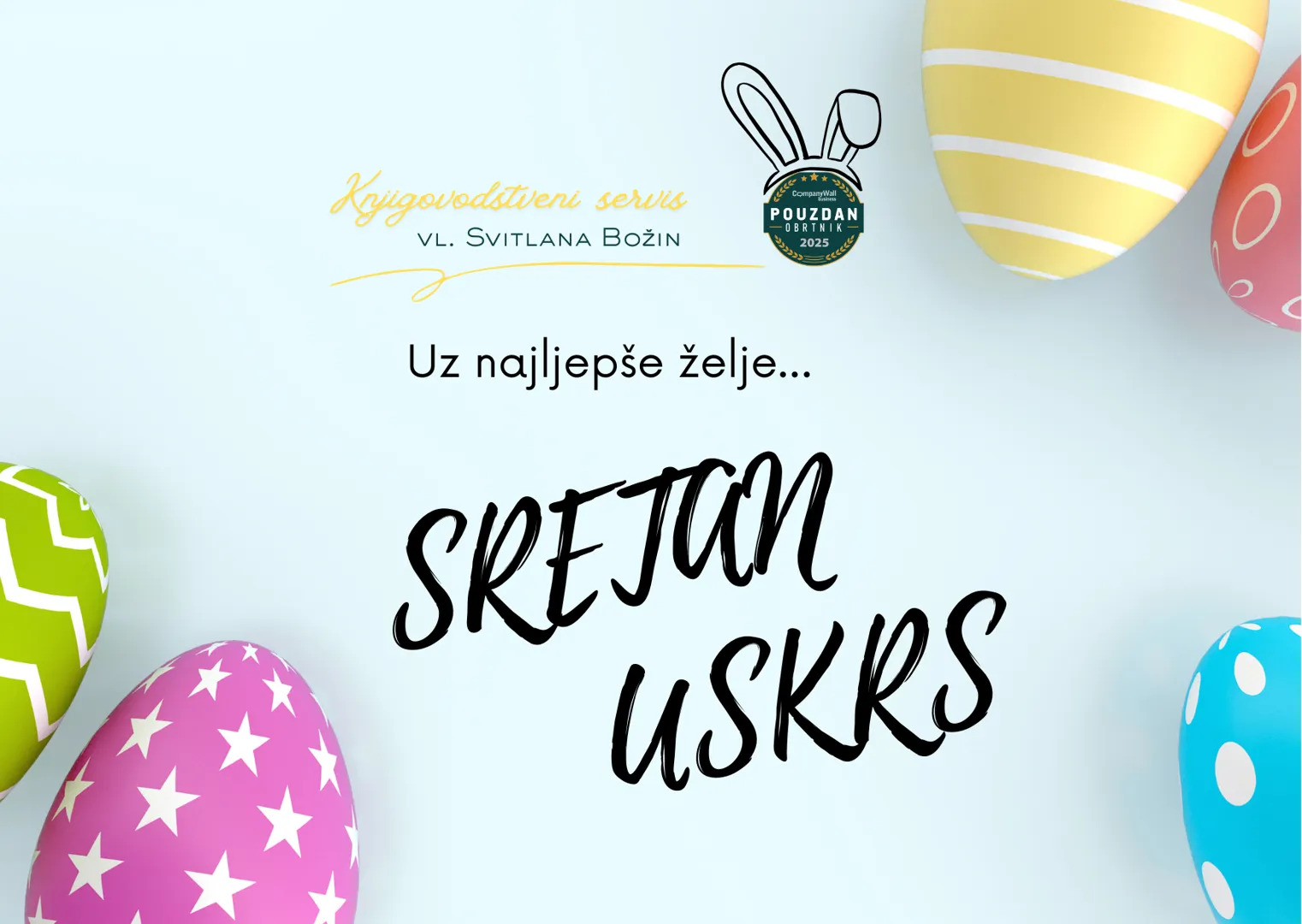 O nama: Računovodstveni servis koji vaše poslovanje vodi kao vlastito - odgovorno, precizno i pouzdano. Brinemo o knjigovodstvu, plaćama, PDV-u i svim zakonskim obvezama kako biste imali sigurnost i mir u svakodnevnom poslovanju. Našu pouzdanost potvrđuje priznanje Pouzdan obrtnik, dodijeljeno kroz nezavisnu procjenu tvrtke CompanyWall. Klijentima nudimo osoban pristup i dugoročnu suradnju temeljenu na povjerenju.