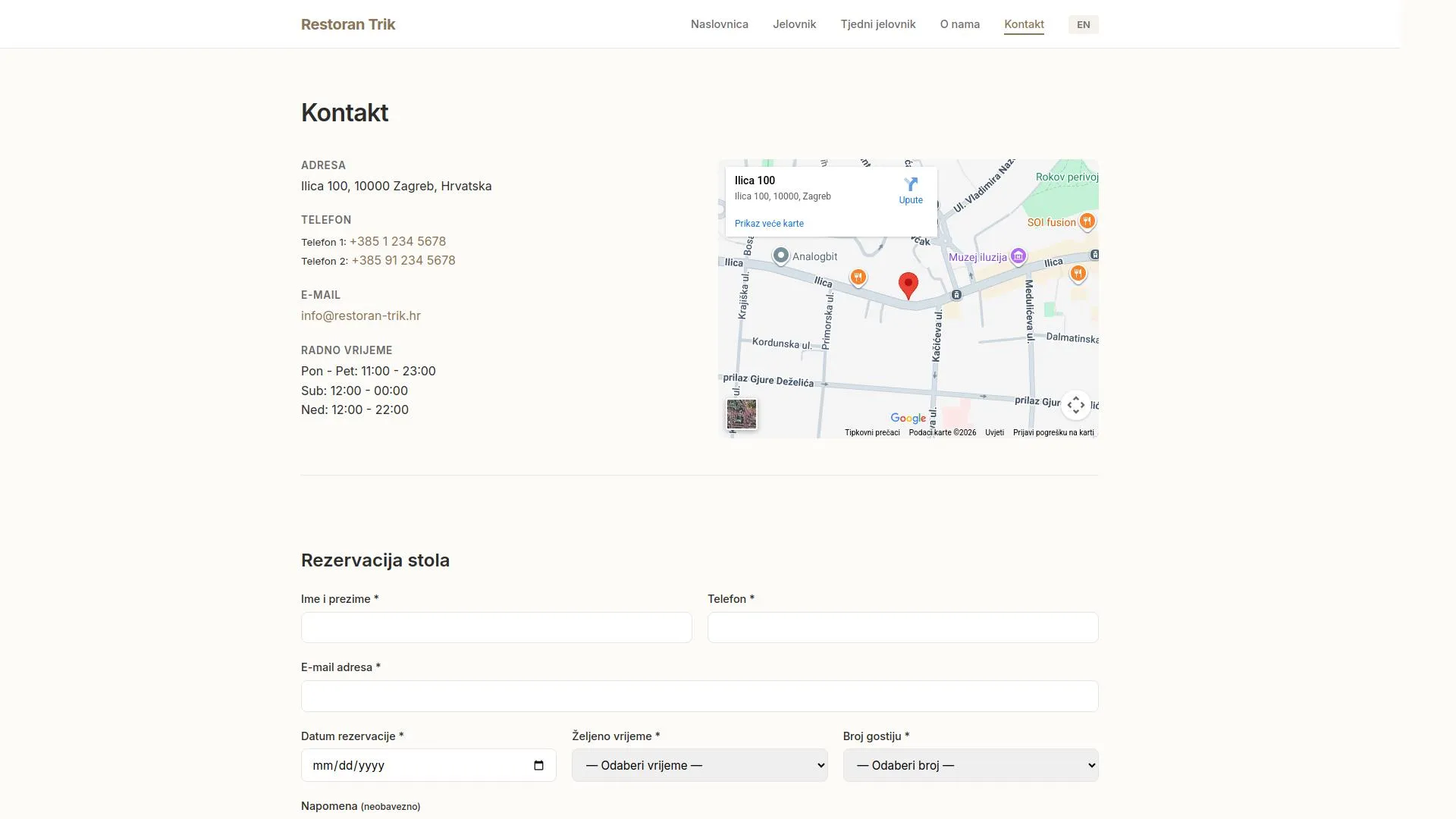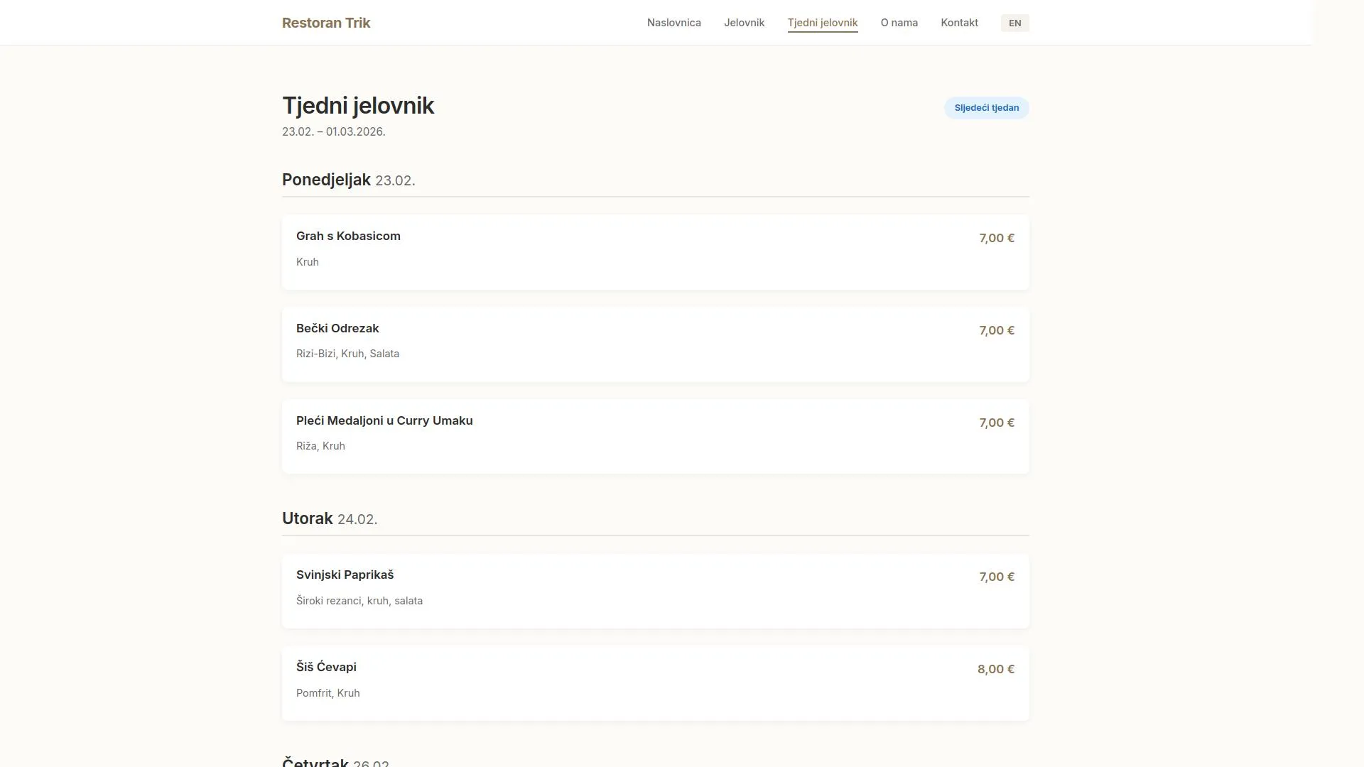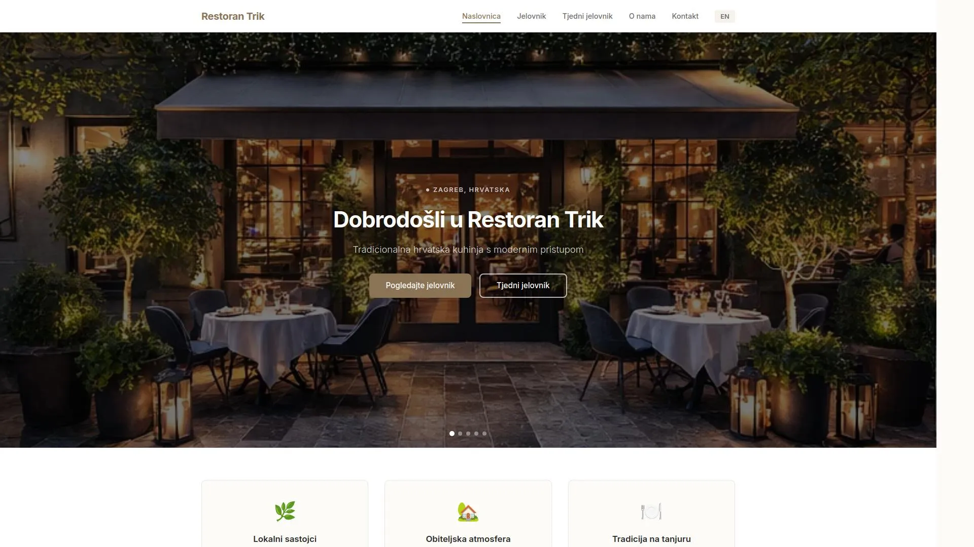 O nama: Trik d.o.o. je specijalizirana tvrtka za izradu modernih i funkcionalnih web stranica za restorane, kafiće, male i poduzetnike. Pomažemo klijentima povećati online prisutnost kroz profesionalan dizajn, optimizaciju za tražilice i jednostavne sustave za upravljanje sadržajem. Fokusirani smo na kvalitetu, pouzdanost i dugoročnu suradnju.