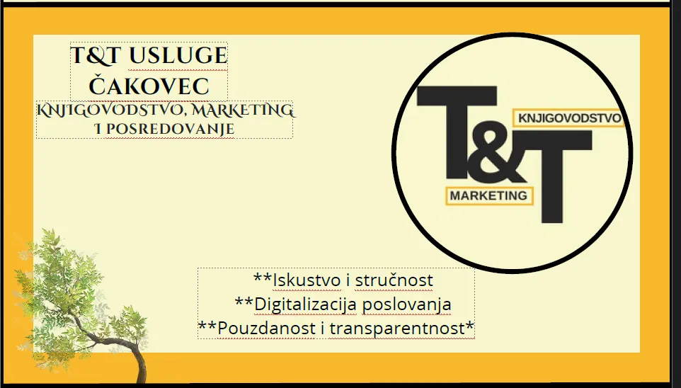 O nama: T&T usluge je moderan i pouzdan računovodstveni servis smješten u Čakovcu. Specijalizirani smo za pružanje računovodstvenih usluga malim i srednjim poduzetnicima, obrtnicima i j.d.o.o. poduzećima, s naglaskom na digitalizaciju i individualni pristup. Naše usluge Nudimo kompletne knjigovodstvene i računovodstvene usluge: • • Vođenje poslovnih knjiga za obrte i j.d.o.o. • • Knjiženje i obračun PDV-a • • Obračun plaća, honorara i doprinosa • • Izrada godišnjih financijskih izvještaja