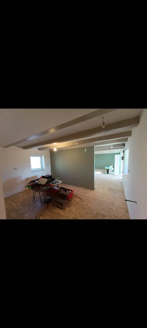 Stan na katu kuće. Potrebno je rusenje 2 postojeća zida i pregrađivanje knaufom (3 zida). Izbijanje i postavljanje najmanje 1 krovnog prozora. Prenamjena malog (4m2) kupatila u sobu. U kupatilu dodatni wc i umivaonik (sa svim prikljuccima) te premjestanje postojecih odvoda, dovoda i postavljanje sanitarija. Probijanje zida i postavljanje 1 balkonska vrata te spustanje 1 postojecih balkonskih vrata. Smanjivanje 2 prozora. Dodatni dovod i odvod vode u kuhinji. Pstavljanje podova (laminat, cca 90m2) i keramike cca 40m2. Premjestanje radijatora. Postavljanje knaufa na strop na cca 60m2.