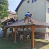 Drvena nadstrešnica na terasi pokrivena crnim crijepom koja se naslanja na kuću.Širina 4m i dubina 2.5 m