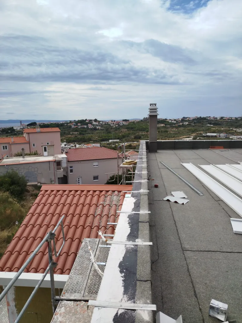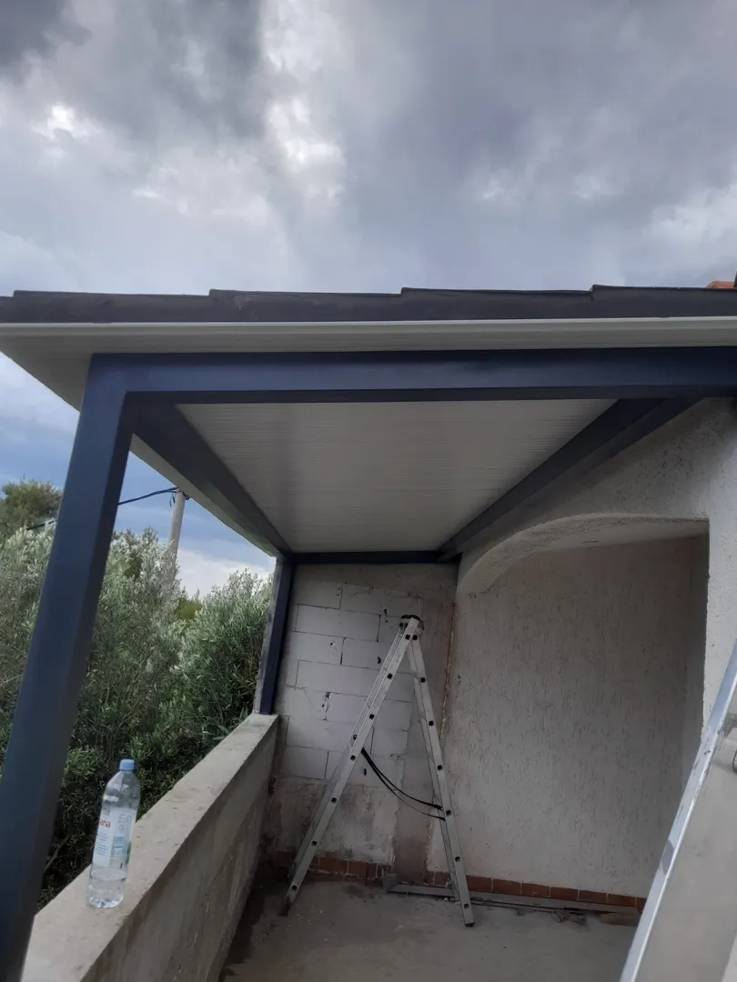 Trenutno je stara nadstrešnica na balkonu koja će biti skinuta u potpunosti. Radovi su na zgradi pa su skele tu za lakšu postavu nove nadstrešnice. Trebam limeni pokrov i izradu nadstrešnice dimenzija cca *cm. Konstrukcija/cijevi na koju ide nadstrešnica postoje. Prilažem slike stare nadstrešnice. Trebala bih novu nadstrešnicu do cca 1. lipnja