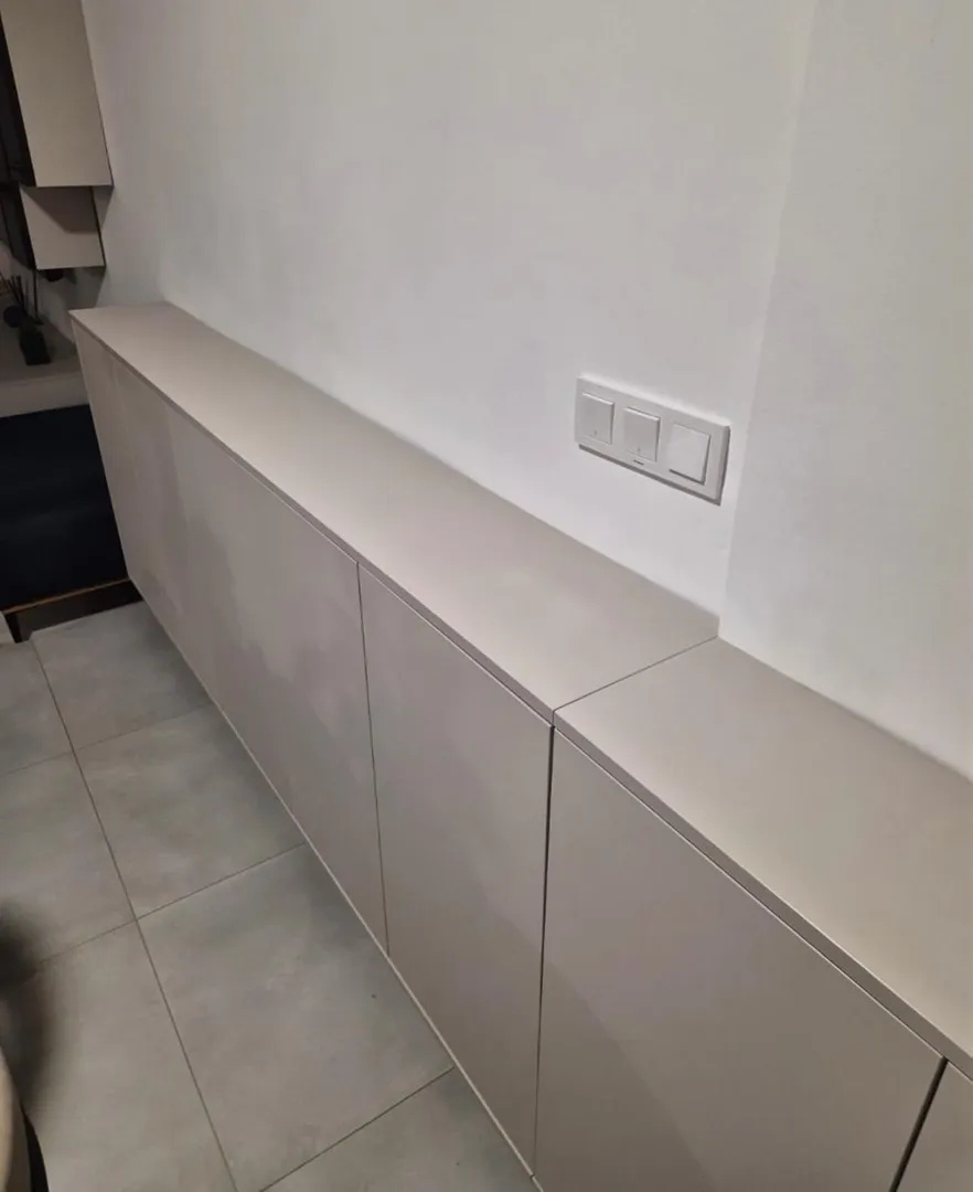 S obje strane kuhinje je zid, cm je dužina, a visina do stropa je cm. S lijeve strane bih stavila ugradbeni hladnjak sa zamrzivačem dolje, a s desne pećnicu i mikrovalnu. Ploča je indukcijska te iznad nje trebam ugradbenu napu koja mora biti filtracijska. Dimenzije sudopera su u linku dolje. https://www.fero-term.hr/sudoper/prid/ Lijevo od sudopera je perilica. Fronte smo našli u Elgradu (Madre Perla), radna ploča i cokl bi bili bijeli. Između elemenata razmak na zidu bih trebala od 60cm, za pločice.