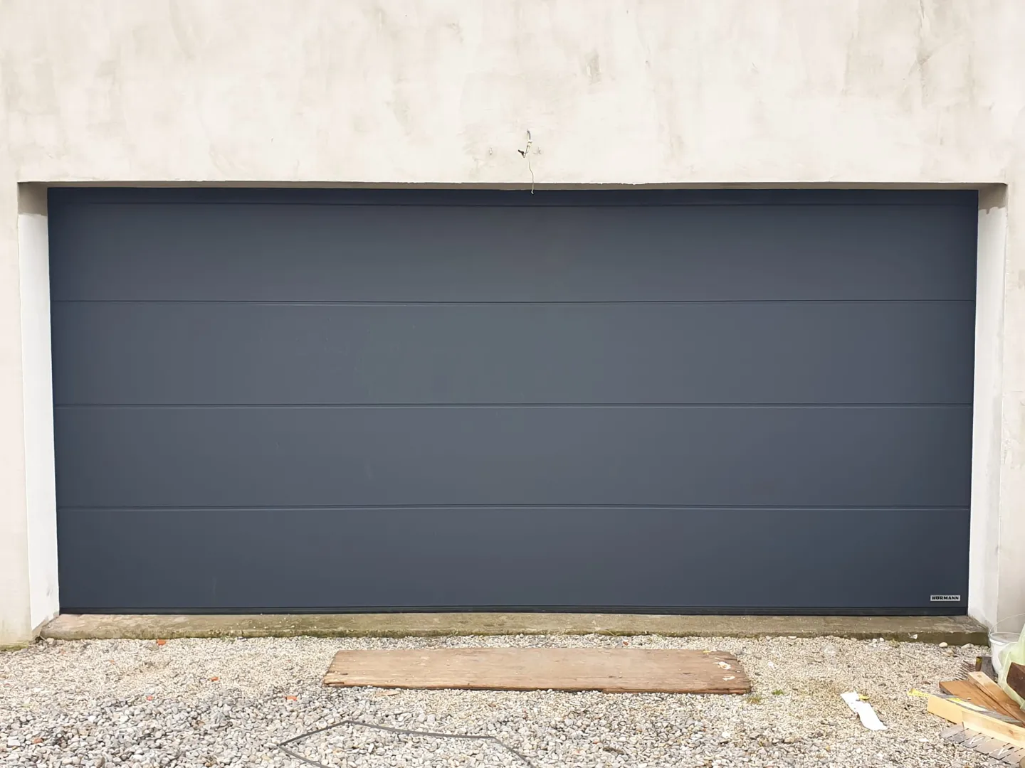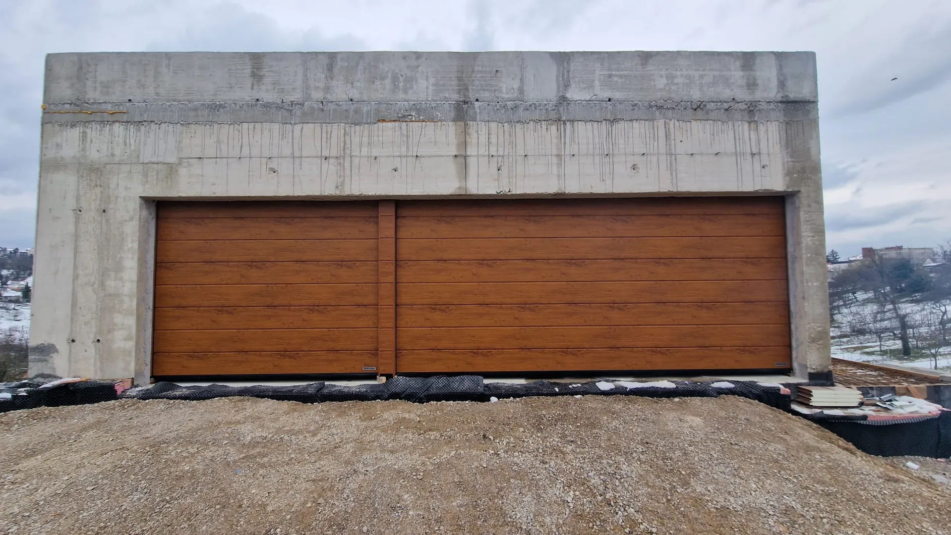 Garažna vrata: Dobava i ugradba segmentnih garažnih vrata od PLASTIFICIRANIH čeličnih profila , za zidarski otvor / cm tip kao TLC proizvođač AMCRO. Lamele sekcija su ispunjene poliuretanskom pjenom min 4 cm. Kompletno s okovom, brtvljenjem, pragom, pokrovnim letvicama, te vanjskim bočnim i gornjim limenim opšavom. Sve od plastificiranog aluminija.Kreću se ispod konstrukcije objekta na potrebnim vodilicama, sa ručnim zaključavanjem i uklopnom bravom, mogućnost otvaranja i zatvaranja samo sa unutarnje strane, ručna lančana rala s podlogom, horizontalno postavljena ručka s unutarnje strane na strani lančanog mehanizma, na vanjskoj strani bez ručke ili utora, vrata sa vanjske strane su glatka, bez ostakljenih dijelova. Vrata sa kompletnom automatikom.