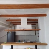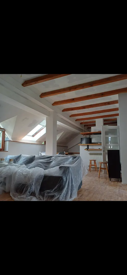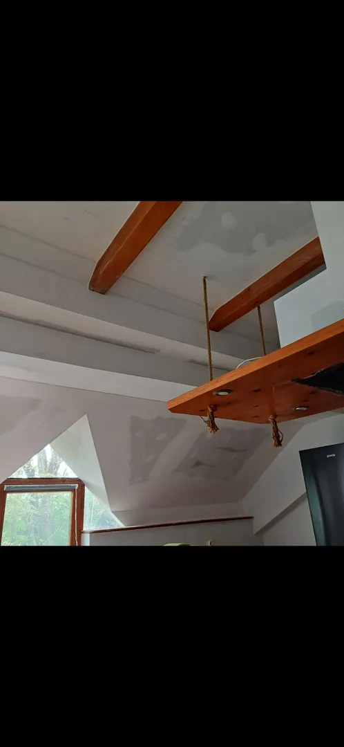 Spušteni strop na drvene grede, bez izolacije, bez folije, sve ravno, visina drvenih greda 2.60m spušta se na oko 2.50m.